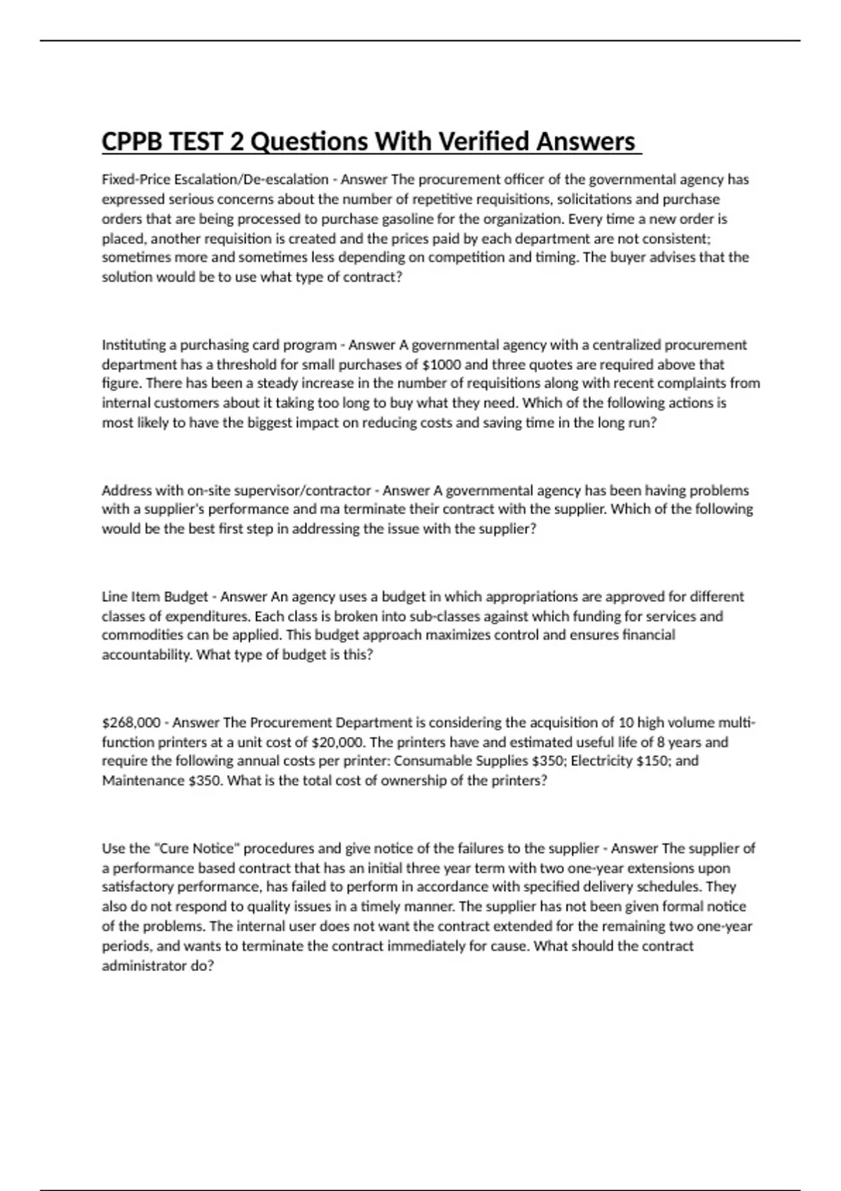 Fixed-Price Escalation/De-escalation - Answer The procurement officer of the governmental agency has expressed serious concerns about the number of repetitive requisitions, solicitations and purchase orders that are being processed to purchase gasoline for the organization. Every time a new order is placed, another requisition is created and the prices paid by each department are not consistent; sometimes more and sometimes less depending on competition and timing. The buyer advises that the solution would be to use what type of contract? Instituting a purchasing card program - Answer A governmental agency with a centralized procurement department has a threshold for small purchases of $1000 and three quotes are required above that figure. There has been a steady increase in the number of requisitions along with recent complaints from internal customers about it taking too long to buy what they need. Which of the following actions is most likely to have the biggest impact on reducing costs and saving time in the long run? Address with on-site supervisor/contractor - Answer A governmental agency has been having problems with a supplier's performance and ma terminate their contract with the supplier. Which of the following would be the best first step in addressing the issue with the supplier? Line Item Budget - Answer An agency uses a budget in which appropriations are approved for different classes of expenditures. Each class is broken into sub-classes against which funding for services and commodities can be applied. This budget approach maximizes control and ensures financial accountability. What type of budget is this? $268,000 - Answer The Procurement Department is considering the acquisition of 10 high volume multi-function printers at a unit cost of $20,000. The printers have and estimated useful life of 8 years and require the following annual costs per printer: Consumable Supplies $350; Electricity $150; and Maintenance $350. What is the total cost of ownership of the printers? Use the "Cure Notice" procedures and give notice of the failures to the supplier - Answer The supplier of a performance based contract that has an initial three year term with two one-year extensions upon satisfactory performance, has failed to perform in accordance with specified delivery schedules. They also do not respond to quality issues in a timely manner. The supplier has not been given formal notice of the problems. The internal user does not want the contract extended for the remaining two one-year periods, and wants to terminate the contract immediately for cause. What should the contract administrator do? Forming - Answer The members of the team are getting to know one another and learning about the knowledge and skills that each brings to th e team Issue a change order under the existing contract - Answer A supplier has completed the work identified in the specifications, but the government agency has determined that additional work is required to complete the project. What should the buyer do to get this work done. Cost avoidance - Answer A procurement department is diligent to ensure that a solicitation does not have to be cancelled and re-competed. This activity achieves what organizational goals? Provides a common repository for data - Answer Which of the following is a benefit of an automated procurement system? cooperative contract - Answer The agency would like to "piggyback" its purchases with other agencies that are participating in cooperative purchasing. When using a "piggyback" method, what would the arrangement be called? Recorder - Answer On the team Susan writes down key points on a flip chart pad. What team role is Susan playing? Capital Fund - Answer A governmental agency processed a purchase requisition for the purchase of 250 street lights with new LED light fixtures. Which fund should a procurement agent check to confirm that the money was available for this purchase? Inventory management - Answer the county garage manager is responsible for maintaining stock of often-used commodities such as air filters, engine oil, and brake pads. In order not to overstock, he forecasts the anticipated need based on historical data and making an analysis is a key function of what process?