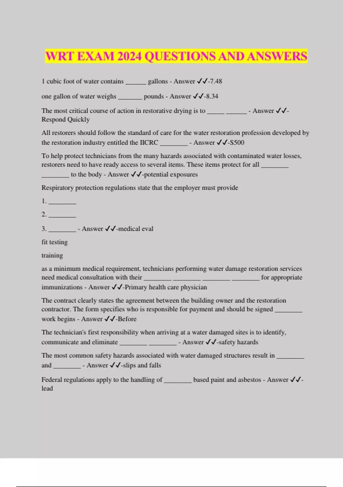 WRT EXAM 2024 QUESTIONS AND ANSWERS 1 cubic foot of water contains ______ gallons - Answer ️️ -7.48 one gallon of water weighs _______ pounds - Answer ️️ -8.34 The most critical course of action in restorative drying is to _____ ______ - Answer ️️ - Respond Quickly All restorers should follow the standard of care for the water restoration profession developed by the restoration industry entitled the IICRC ________ - Answer ️️ -S500 To help protect technicians from the many hazards associated with contaminated water losses, restorers need to have ready access to several items. These items protect for all ________ ________ to the body - Answer ️️ -potential exposures Respiratory protection regulations state that the employer must provide 1. ________ 2. ________ 3. ________ - Answer ️️ -medical eval fit testing training as a minimum medical requirement, technicians performing water damage restoration services need medical consultation with their ________ ________ ________ ________ for appropriate immunizations - Answer ️️ -Primary health care physician The contract clearly states the agreement between the building owner and the restoration contractor. The form specifies who is responsible for payment and should be signed ________ work begins - Answer ️️ -Before The technician's first responsibility when arriving at a water damaged sites is to identify, communicate and eliminate ________ ________ - Answer ️️ -safety hazards The most common safety hazards associated with water damaged structures result in ________ and ________ - Answer ️️ -slips and falls Federal regulations apply to the handling of ________ based paint and asbestos - Answer ️️ - lead after safety concerns have been addressed and the initial water source has been stopped, the restorer must complete an evaluation of the water's migration through the structure. During this process, the restorer inspects all ________ ________ areas - Answer ️️ -potentially affected the ultimate goal is to find the "edge" of water migration, which moves in a three-dimensional path throughout the structure. This is accomplished across carpeted surfaces using a ________ ________, and across most hard surfaces using a ________ (non-penetrating) moisture meter. - Answer ️️ -moisture sensor non-invasive Water from a clean source with no substantial risk of causing sickness or discomfort is said to be ________ ________ water - Answer ️️ -Category one Water that has a significant degree of chemical, biological, and/or physical contamination and potential to cause sickness or discomfort is ________ ________ water - Answer ️️ -Category two When water intrusion results from a grossly unsanitary source or carries ________ (disease causing) agents, it is said to be a Category 3 - Answer ️️ -pathog