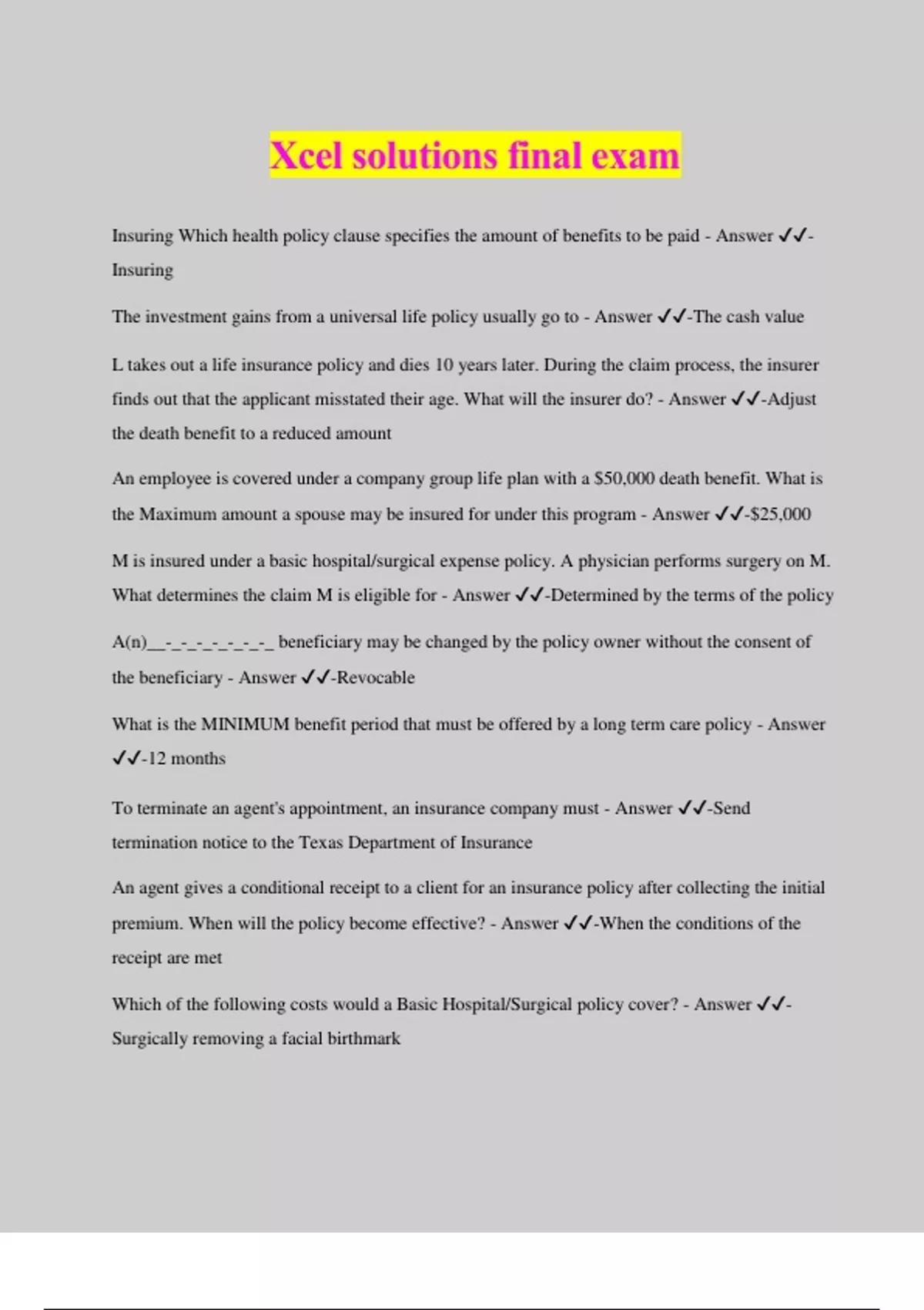 Xcel solutions final exam Insuring Which health policy clause specifies the amount of benefits to be paid - Answer ️️ - Insuring The investment gains from a universal life policy usually go to - Answer ️️ -The cash value L takes out a life insurance policy and dies 10 years later. During the claim process, the insurer finds out that the applicant misstated their age. What will the insurer do? - Answer ️️ -Adjust the death benefit to a reduced amount An employee is covered under a company group life plan with a $50,000 death benefit. What is the Maximum amount a spouse may be insured for under this program - Answer ️️ -$25,000 M is insured under a basic hospital/surgical expense policy. A physician performs surgery on M. What determines the claim M is eligible for - Answer ️️ -Determined by the terms of the policy A(n)__-_-_-_-_-_-_-_ beneficiary may be changed by the policy owner without the consent of the beneficiary - Answer ️️ -Revocable What is the MINIMUM benefit period that must be offered by a long term care policy - Answer ️️ -12 months To terminate an agent's appointment, an insurance company must - Answer ️️ -Send termination notice to the Texas Department of Insurance An agent gives a conditional receipt to a client for an insurance policy after collecting the initial premium. When will the policy become effective? - Answer ️️ -When the conditions of the receipt are met Which of the following costs would a Basic Hospital/Surgical policy cover? - Answer ️️ - Surgically removing a facial birthmark Which of the following statements is CORRECT about an agent who is taking an insurance application - Answer ️️ -The agent should have the applicant initial any changes made on the application Which statement is true about a whole life policy - Answer ️️ -Cash value may be borrowed against How long does an insurance company appointment remain in force - Answer ️️ -Until terminated Which of the following statements about health coverage for newborns is NOT true? - Answer ️️ -Coverage is LIMITED to only congenital defects Medicare Part A and Part B do NOT pay for - Answer ️️ -Dental care An insurance company receives E's application for an individual health policy. E did not complete all of the medical history questions because she could not remember the exact dates. E signed the policy and submitted it to the insurance company anyway. A few weeks later, E suffers a heart attack and is hospitalized without completing the medical history questions and paying the initial premium. E is not insured. Which of the following clauses details the conditions that E did not meet? - Answer ️️ -Consideration cla