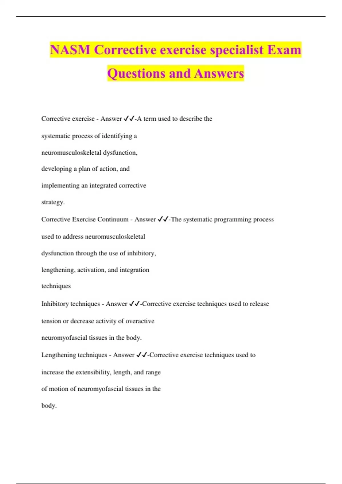 Corrective exercise - Answer ️️-A term used to describe the systematic process of identifying a neuromusculoskeletal dysfunction, developing a plan of action, and implementing an integrated corrective strategy. Corrective Exercise Continuum - Answer ️️-The systematic programming process used to address neuromusculoskeletal dysfunction through the use of inhibitory, lengthening, activation, and integration techniques