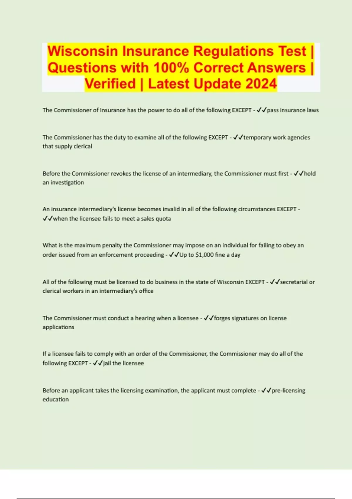 Wisconsin Insurance Regulations Test | Questions with 100% Correct Answers | Verified | Latest Update 2024