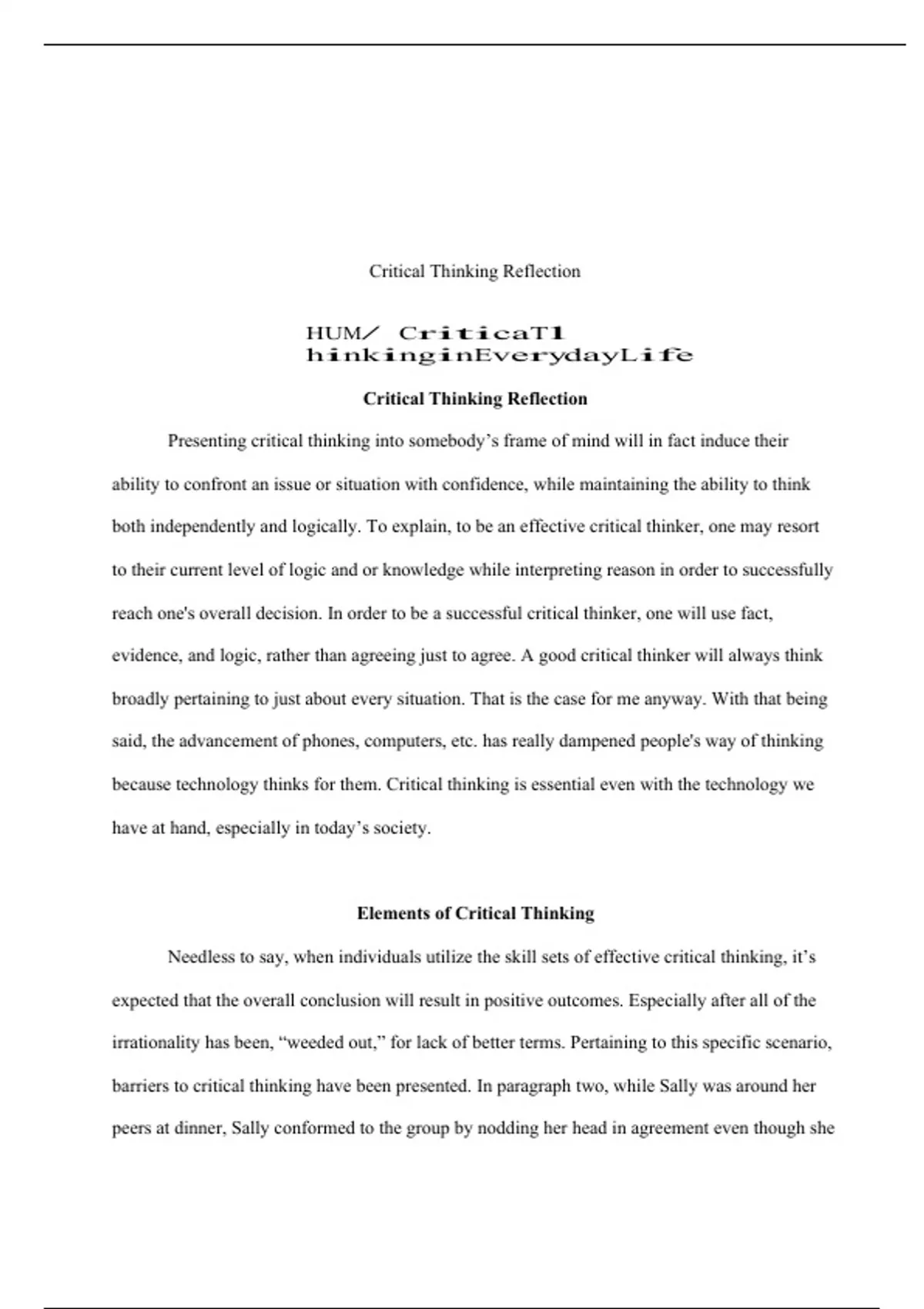 completed hum115 v10 wk5 reflection Critical Thinking Reflection HUM/ CriticaTl hinkinginEverydayLife Critical Thinking Reflection Presenting critical thinking into somebody’s frame of mind will in fact induce their ability to confront an issue or situation with confidence, while maintaining the ability to think both independently and logically. To explain, to be an effective critical thinker, one may resort to their current level of logic and or knowledge while interpreting reason in order to successfully reach one's overall decision. In order to be a successful critical thinker, one will use fact, evidence, and logic, rather than agreeing just to agree. A good critical thinker will always think broadly pertaining to just about every situation. That is the case for me anyway. With that being said, the advancement of phones, computers, etc. has really dampened people's way of thinking because technology thinks fo