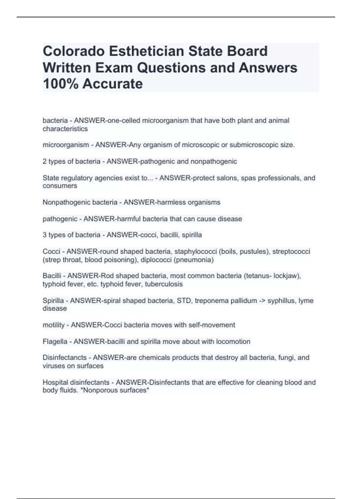 Colorado Esthetician State Board Written Exam Questions and Answers 100% AccurateColorado Esthetician State Board Written Exam Questions and Answers 100% AccurateColorado Esthetician State Board Written Exam Questions and Answers 100% Accurate bacteria - ANSWER-one-celled microorganism that have both plant and animal characteristics microorganism - ANSWER-Any organism of microscopic or submicroscopic size. 2 types of bacteria - ANSWER-pathogenic and nonpathogenic State regulatory agencies exist to... - ANSWER-protect salons, spas professionals, and