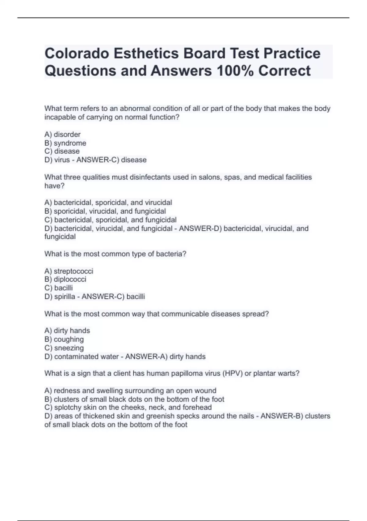 Colorado Esthetics Board Test Practice Questions and Answers 100% CorrectColorado Esthetics Board Test Practice Questions and Answers 100% CorrectColorado Esthetics Board Test Practice Questions and Answers 100% Correct What term refers to an abnormal condition of all or part of the body that makes the body incapable of carrying on normal function? A) disorder B) syndrome C) disease D) virus - ANSWER-C) disease What three qualities must disinfectants used in salons, spas, and medical facilities have? A) bactericidal, sporicidal, and virucidal B) sporicidal, virucidal, and fungicidal C) bactericidal, sporicidal, and fungicidal D) bactericidal, virucidal, and fungicidal - ANSWER-D) bactericidal, virucidal, and fungicidal What is the most common type of bacteria? A) streptococci B) diplococci C) bacilli D) spirilla - ANSWER-C) bacilli What is the most common way that communicable diseases spread? A) dirty hands B) coughing C) sneezing D) contaminated water - ANSWER-A) dirty hands What is a sign that a client has human papilloma virus (HPV) or plantar warts? A) redness and swelling surrounding an open wound B) clusters of small black dots on the bottom of the foot C) splotchy skin on the cheeks, neck, and forehead D) areas of thickened skin and greenish specks around the nails - ANSWER-B) clusters of small black dots on the bottom of the foot