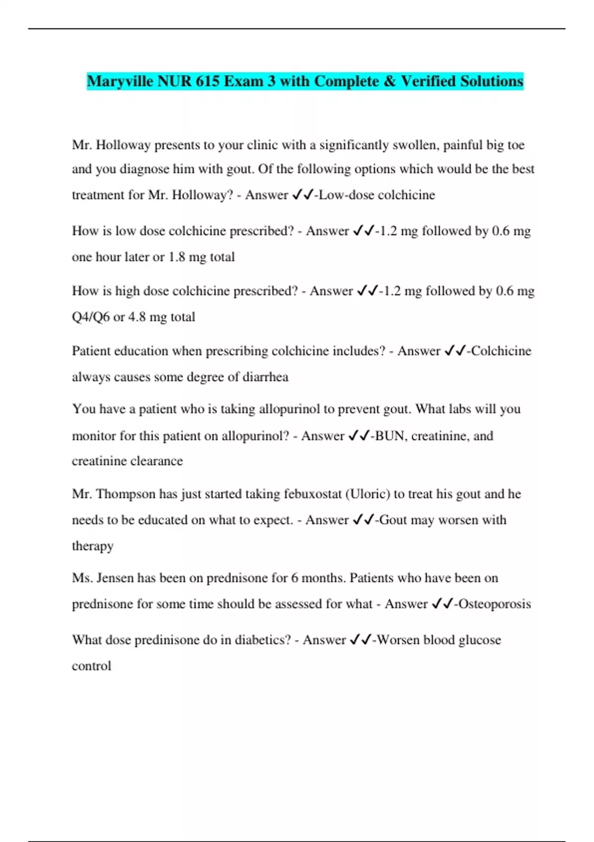 Mr. Holloway presents to your clinic with a significantly swollen, painful big toe and you diagnose him with gout. Of the following options which would be the best treatment for Mr. Holloway? - Answer ️️-Low-dose colchicine How is low dose colchicine prescribed? - Answer ️️-1.2 mg followed by 0.6 mg one hour later or 1.8 mg total How is high dose colchicine prescribed? - Answer ️️-1.2 mg followed by 0.6 mg Q4/Q6 or 4.8 mg total