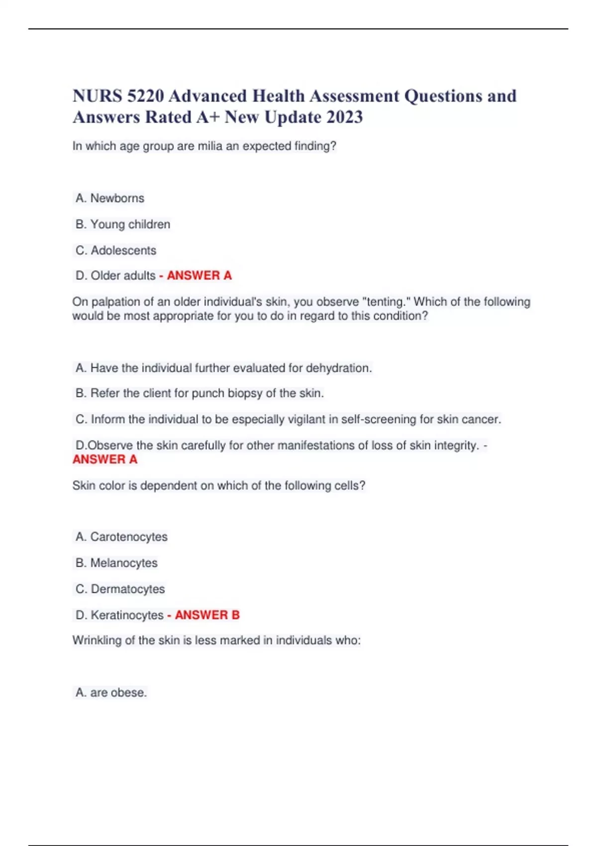 NURS 5220 Advanced Health Assessment Questions and Answers Rated A+ New Update 2023 In which age group are milia an expected finding? A. Newborns B. Young children C. Adolescents D. Older adults - ANSWER A On palpation of an older individual's skin, you observe "tenting." Which of the following would be most appropriate for you to do in regard to this condition? A. Have the individual further evaluated for dehydration. B. Refer the client for punch biopsy of the skin. C. Inform the individual to be especially vigilant in self-screening for skin cancer. D.Observe the skin carefully for other manifestations of loss of skin integrity. - ANSWER A Skin color is dependent on which of the following cells? A. Carotenocytes B. Melanocytes C. Dermatocytes D. Keratinocytes - ANSWER B Wrinkling of the skin is less marked in individuals who: A. are obese. B. demonstrate premature graying. C. are white. D. have overactive sebaceous and sweat gland activity. - ANSWER A Molding of the infant's head is caused by: A. premature closure of the fontanels. B. shifting and overlapping of the skull bones during birth. C. subperiosteal edema. D. increased cerebrospinal fluid. - ANSWER B In addition to the head, neck, axilla, and inguinal areas, the examiner may also assess lymph nodes: A. on the palmar aspect of the hands. B. in the popliteal region. C. in the patellar region. D. on the dorsum of the foot. - ANSWER B When you ask the patient to clench the teeth and then to smile, which cranial nerve are you testing? A. Trochlear B. Abducens C. Facial D. Vagus - ANSWER C The color of the nasal mucosa should appear: A. deep pink. B. red. C. bluish gray. D. pale pink. - ANSWER A The pneumatic attachment to the otoscope is used to evaluate which characteristic of the tympanic membrane? A. Vibrations B. Mobility C.Tension D.Strength - ANSWER B A tympanic membrane that is retracted is also more: A. concave. B. convex. C. impacted. D. dilated. - ANSWER A To which problem are older individuals more prone? A. Increased sensitivity to tastes B. Hyperactivity of the salivary glands C. Decreased salivation D. Edema of the tongue - ANSWER C During the course of the interview, a patient indicates that he has been given the drug gentamicin (an aminoglycoside antibiotic) for an upper respiratory infection. Based on this information, you would check for which type of problem?