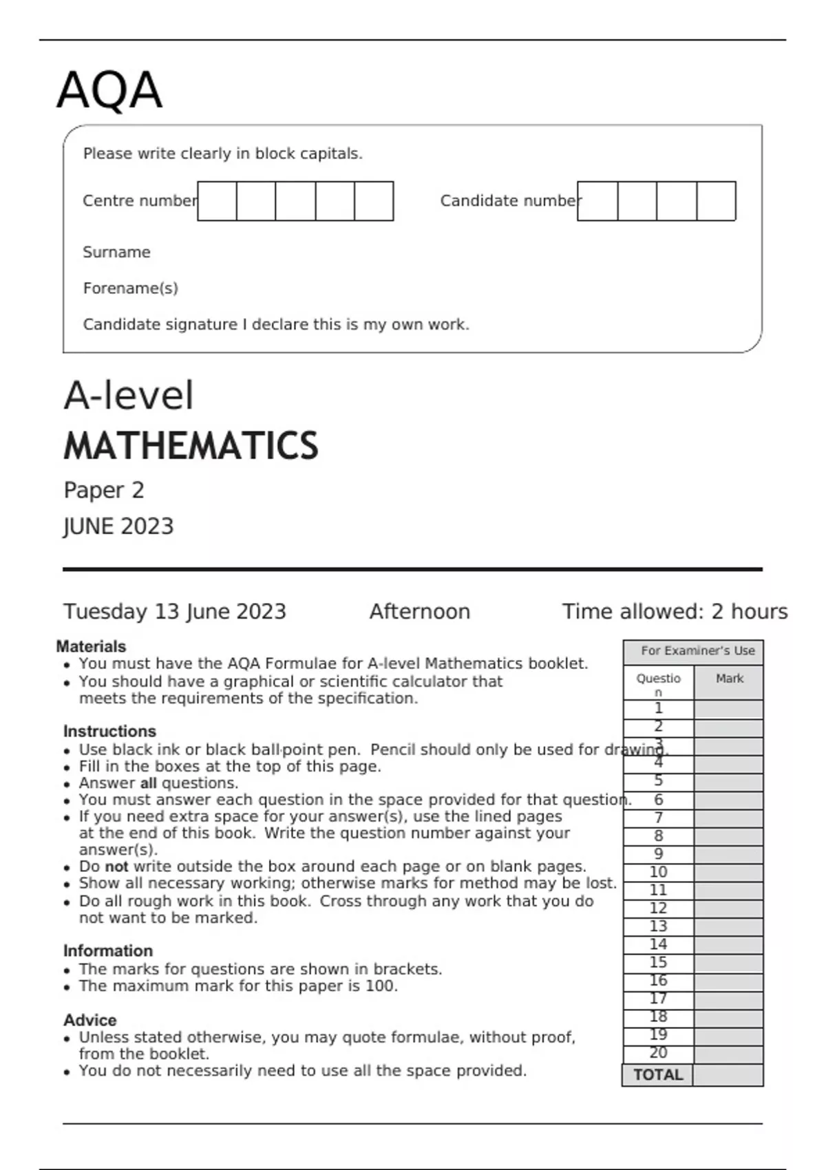 AQA A-level MATHEMATICS Paper 2 JUNE 2023 FINAL QUESTION PAPER