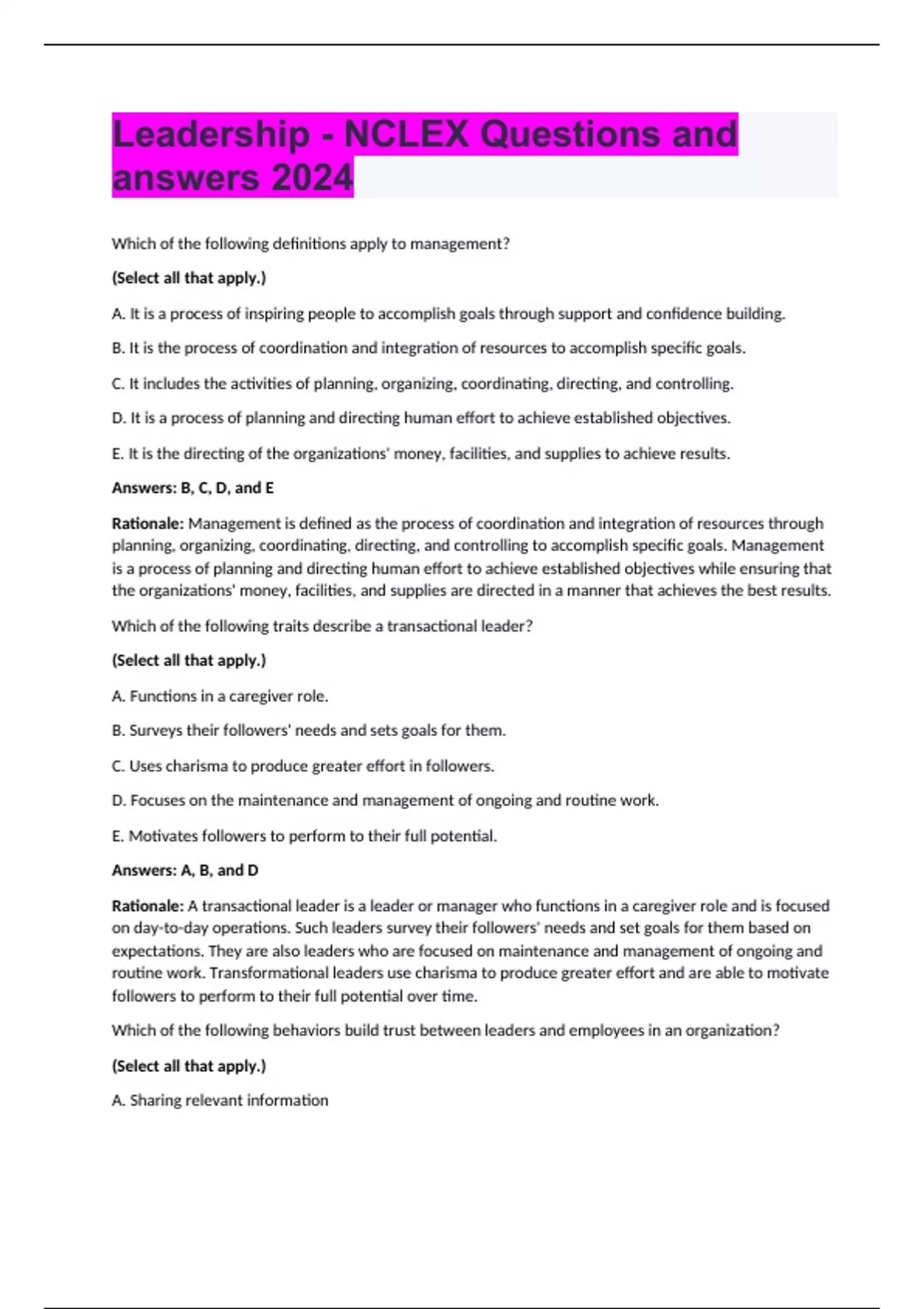 Which of the following definitions apply to management? (Select all that apply.) A. It is a process of inspiring people to accomplish goals through support and confidence building. B. It is the process of coordination and integration of resources to accomplish specific goals. C. It includes the activities of planning, organizing, coordinating, directing, and controlling. D. It is a process of planning and directing human effort to achieve established objectives. E. It is the directing of the organizations' money, facilities, and supplies to achieve results. Answers: B, C, D, and E Rationale: Management is defined as the process of coordination and integration of resources through planning, organizing, coordinating, directing, and controlling to accomplish specific goals. Management is a process of planning and directing human effort to achieve established objectives while ensuring that the organizations' money, facilities, and supplies are directed in a manner that achieves the best results. Which of the following traits describe a transactional leader? (Select all that apply.) A. Functions in a caregiver role. B. Surveys their followers' needs and sets goals for them. C. Uses charisma to produce greater effort in followers. D. Focuses on the maintenance and management of ongoing and routine work. E. Motivates followers to perform to their full potential. Answers: A, B, and D Rationale: A transactional leader is a leader or manager who functions in a caregiver role and is focused on day-to-day operations. Such leaders survey their followers' needs and set goals for them based on expectations. They are also leaders who are focused on maintenance and management of ongoing and routine work. Transformational leaders use charisma to produce greater effort and are able to motivate followers to perform to their full potential over time. Which of the following behaviors build trust between leaders and employees in an organization? (Select all that apply.) A. Sharing relevant information B. Encouraging competition via winners and losers C. Reducing controls D. Meeting expectations E. Avoiding discussion of sensitive issues Answers: A, C, and D Rationale: Leadership is founded on trust. Behaviors that build trust include sharing relevant information, reducing controls, and meeting expectations. Trust-destroying behaviors include being insensitive to beliefs and values, avoiding discussion of sensitive issues, and encouraging competition Which of the following is true of management activities: A. Inspiring a vision is a management function. B. Management is focused on task accomplishment. C. Management is more focused on human relationships. D. Management is more important than leadership. Answer: B Rationale: other options have more of leadership tasks The role of the _____ is to provide leadership and direction for all aspects of nursing services with a focus on integrating the system and building a culture. A. nurse manager B. care provider C. nurse executive D. senior leader Answer: C Rationale: The nurse executive's role and functions concentrate on long-term administration of an institution or program that delivers nursing services, focusing on integrating the system and building a culture A medical-surgical unit reports higher rates of patient satisfaction coupled with high rates of staff satisfaction and productivity. Which of the following is attributed to the data findings: A. Effective leadership B. Management involvement C. Mentoring D. Rewards and recognition Answer: A Rationale: Effective leadership is important in nursing because of the impact on nurses' work lives, it being a stabilizing influence during change, and for nurses' productivity and quality of care. A nurse is caring for an elderly patient who was admitted after sustaining a fall at home. When creating a care plan for the patient, she requests that the doctor order a home health visit to assess for home safety and medication compliance. In addition, the nurse is concerned about the nutrition of the patient and requests a dietitian evaluation. The nurse is demonstrating which of the following leadership skills: A. Care provider B. Business principles C. Care coordination D. Change management Answer: C Rationale: Care coordination is the delivery of nursing services that involves the organization and coordination of complex activities. The nurse uses managerial and leadership skills to facilitate delivery of quality care. During a staff meeting, a group of RNs has complained that medications are not arriving to the unit in a timely manner. The nurse manager suggests that the group resolve this issue through the development and work of a multidisciplinary team led by one of these RNs. This scenario demonstrates: A. adaptation. B. empowerment. C. flexibility. D. relationship management. Answer: B Rationale: Empowerment is the giving of authority, responsibility, and the freedom to act. In this situation, the manager has given authority, responsibility, and the freedom to act in the investigation and resolution of this issue. Leadership is best defined as: A. an interpersonal process of participating by encouraging fellowship. B. delegation of authority and responsibility and the coordination of activities. C. inspiring people to accomplish goals through support and confidence building. D. the integration of resources through planning, organizing, and directing Answer: C Rationale: Leadership is the process of influencing people to accomplish goals by inspiring confidence and support among followers. The postoperative patient with anterior cervical laminectomy is complaining of tightness in his throat. His voice is raspy. The staff nurse asks the unit secretary to page the healthcare provider stat. This is an example of _____ leadership. A. Authoritarian B. Democratic C. Laissez-faire D. Servant Answer: A Rationale: Authoritarian leadership uses directive and controlling behaviors in which the leader determines policies and m