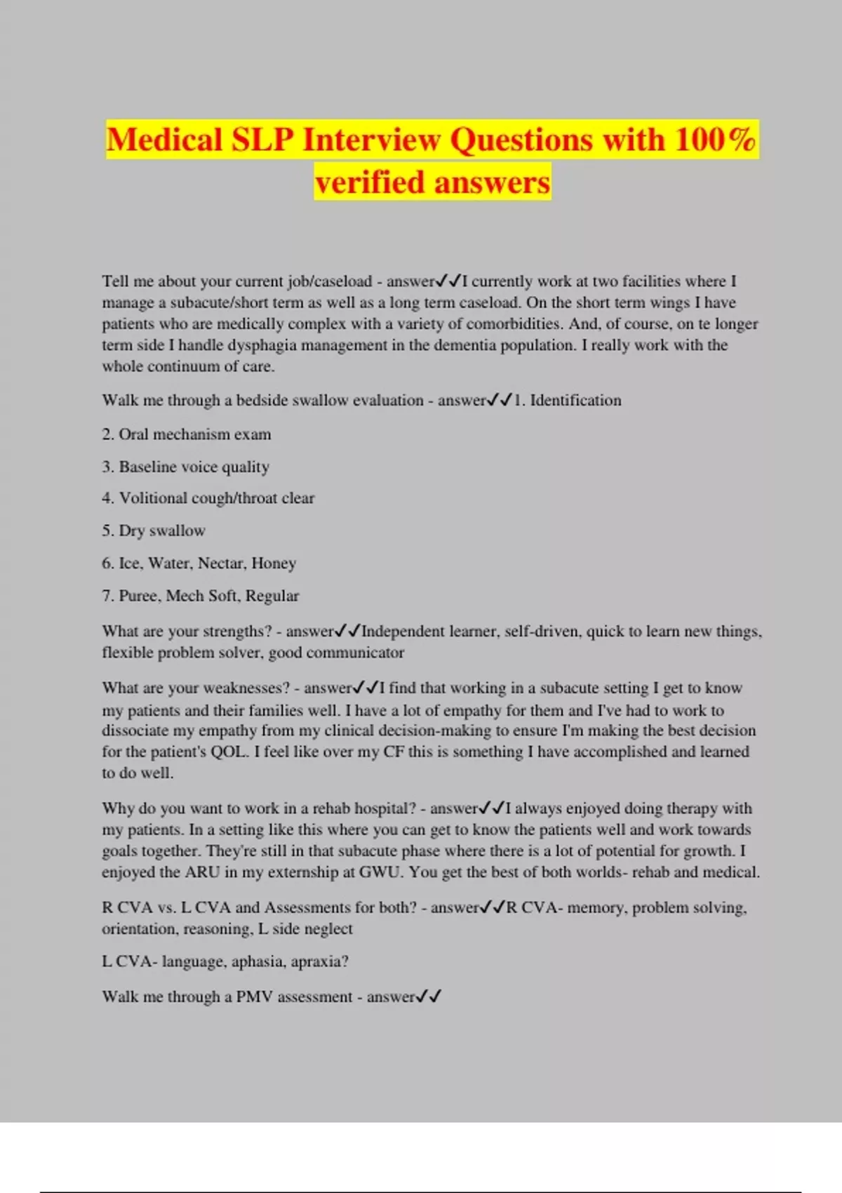 Medical SLP Interview Questions with 100% verified answers Tell me about your current job/caseload - answerI currently work at two facilities where I manage a subacute/short term as well as a long term caseload. On the short term wings I have patients who are medically complex with a variety of comorbidities. And, of course, on te longer term side I handle dysphagia management in the dementia population. I really work with the whole continuum of care. Walk me through a bedside swallow evaluation - answer1. Identification 2. Oral mechanism exam 3. Baseline voice quality 4. Volitional cough/throat clear 5. Dry swallow 6. Ice, Water, Nectar, Honey 7. Puree, Mech Soft, Regular What are your strengths? - answerIndependent learner, self-driven, quick to learn new things, flexible problem solver, good communicator What are your weaknesses? - answerI find that working in a subacute setting I get to know my patients and their families well. I have a lot of empathy for them and I've had to work to dissociate my empathy from my clinical decision-making to ensure I'm making the best decision for the patient's QOL. I feel like over my CF this is something I have accomplished and learned to do well. Why do you want to work in a rehab hospital? - answerI always enjoyed doing therapy with my patients. In a setting like this where you can get to know the patients well and work towards goals together. They're still in that subacute phase where there is a lot of potential for growth. I enjoyed the ARU in my externship at GWU. You get the best of both worlds- rehab and medical. R CVA vs. L CVA and Assessments for both? - answerR CVA- memory, problem solving, orientation, reasoning, L side neglect L CVA- language, aphasia, apraxia? Walk me through a PMV assessment - answer