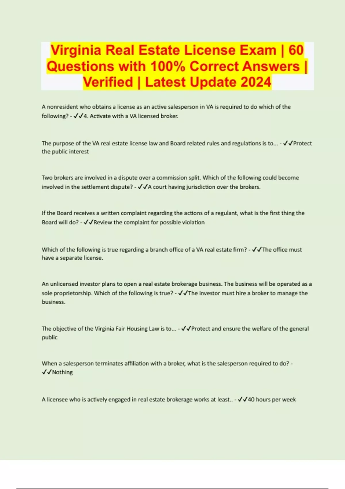 Virginia Real Estate License Exam | 60 Questions with 100% Correct Answers | Verified | Latest Update 2024