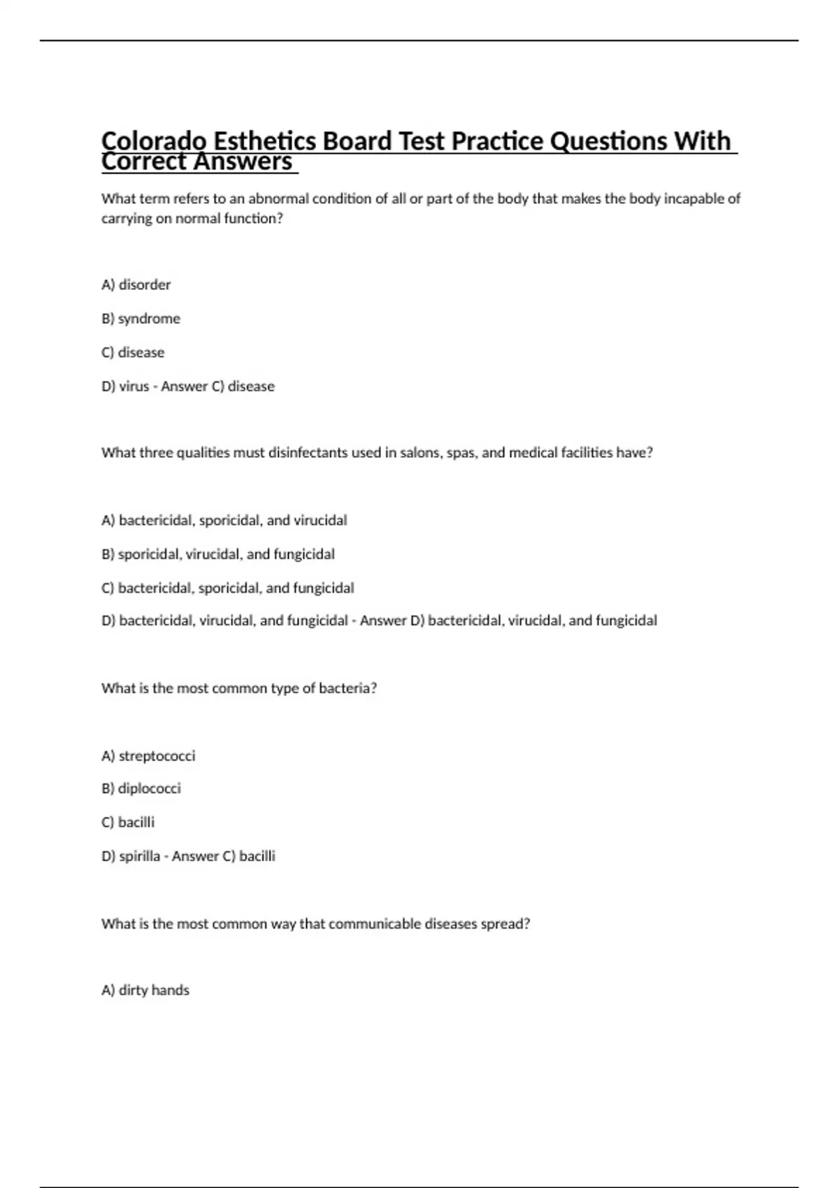 Colorado Esthetics Board Test Practice Questions With Correct Answers