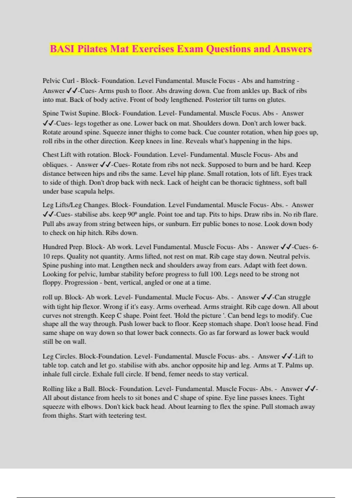 BASI Pilates Mat Exercises Exam Questions and Answers Pelvic Curl - Block- Foundation. Level Fundamental. Muscle Focus - Abs and hamstring - Answer ️️ -Cues- Arms push to floor. Abs drawing down. Cue from ankles up. Back of ribs into mat. Back of body active. Front of body lengthened. Posterior tilt turns on glutes. Spine Twist Supine. Block- Foundation. Level- Fundamental. Muscle Focus. Abs - Answer ️️ -Cues- legs together as one. Lower back on mat. Shoulders down. Don't arch lower back. Rotate around spine. Squeeze inner thighs to come back. Cue counter rotation, when hip goes up, roll ribs in the other direction. Keep knees in line. Reveals what's happening in the hips. Chest Lift with rotation. Block- Foundation. Level- Fundamental. Muscle Focus- Abs and obliques. - Answer ️️ -Cues- Rotate from ribs not neck. Supposed to burn and be hard. Keep distance between hips and ribs the same. Level hip plane. Small rotation, lots of lift. Eyes track to side of thigh. Don't drop back with neck. Lack of height can be thoracic tightness, soft ball under base scapula helps. Leg Lifts/Leg Changes. Block- Foundation. Level Fundamental. Muscle Focus- Abs. - Answer ️️ -Cues- stabilise abs. keep 90⁰ angle. Point toe and tap. Pits to hips. Draw ribs in. No rib flare. Pull abs away from string between hips, or sunburn. Err public bones to nose. Look down body to check on hip hitch. Ribs down. Hundred Prep. Block- Ab work. Level Fundamental. Muscle Focus- Abs - Answer ️️ -Cues- 6- 10 reps. Quality not quantity. Arms lifted, not rest on mat. Rib cage stay down. Neutral pelvis. Spine pushing into mat. Lengthen neck and shoulders away from ears. Adapt with feet down. Looking for pelvic, lumbar stability before progress to full 100. Legs need to be strong not floppy. Progression - bent, vertical, angled or one at a time. roll up. Block- Ab work. Level- Fundamental. Mucle Focus- Abs. - Answer ️️ -Can struggle with tight hip flexor. Wrong if it's easy. Arms overhead. Arms straight. Rib cage down. All about curves not strength. Keep C shape. Point feet. 'Hold the picture '. Can bend legs to modify. Cue shape all the way through. Push lower back to floor. Keep stomach shape. Don't loose head. Find same shape on way down so that lower back connects. Go as far forward as lower back would still be on wall. Leg Circles. Block-Foundation. Level- Fundamental. Muscle Focus- abs. - Answer ️️ -Lift to table top. catch and let go. stabilise with abs. anchor opposite hip and leg. Arms at T. Palms up. inhale full circle. Exhale full circle. If bend, femer needs to stay vertical. Rolling like a Ball. Block- Foundation. Level- Fundamental. Muscle Focus- Abs. - Answer ️️ - All about distance from heels to sit bones and C shape of spine. Eye line passes knees. Tight squeeze with elbows. Don't kick back head. About learning to flex the spine. Pull stomach away from thighs. Start with teetering test. Spine Stretch. Block- Foundation. Level- Fundamental. Muscle Focus - Abs and Back extensors. - Answer ️️ -Start with yoga pose of pushing hands onto mat by sides to get straight spine. OK to bend legs if needed. Looking for lower back to be straight. All about strong in the hip felxors. OK for it to feel strong. Feet mat width and dorsi flexed from ankles not toes. Fire ball under stomach, stomach pulling away from thighs. Don't over stretch. More about opening lower back that flattening upper. Lift up at same time with Abs. Not about how far you can reach. Hand