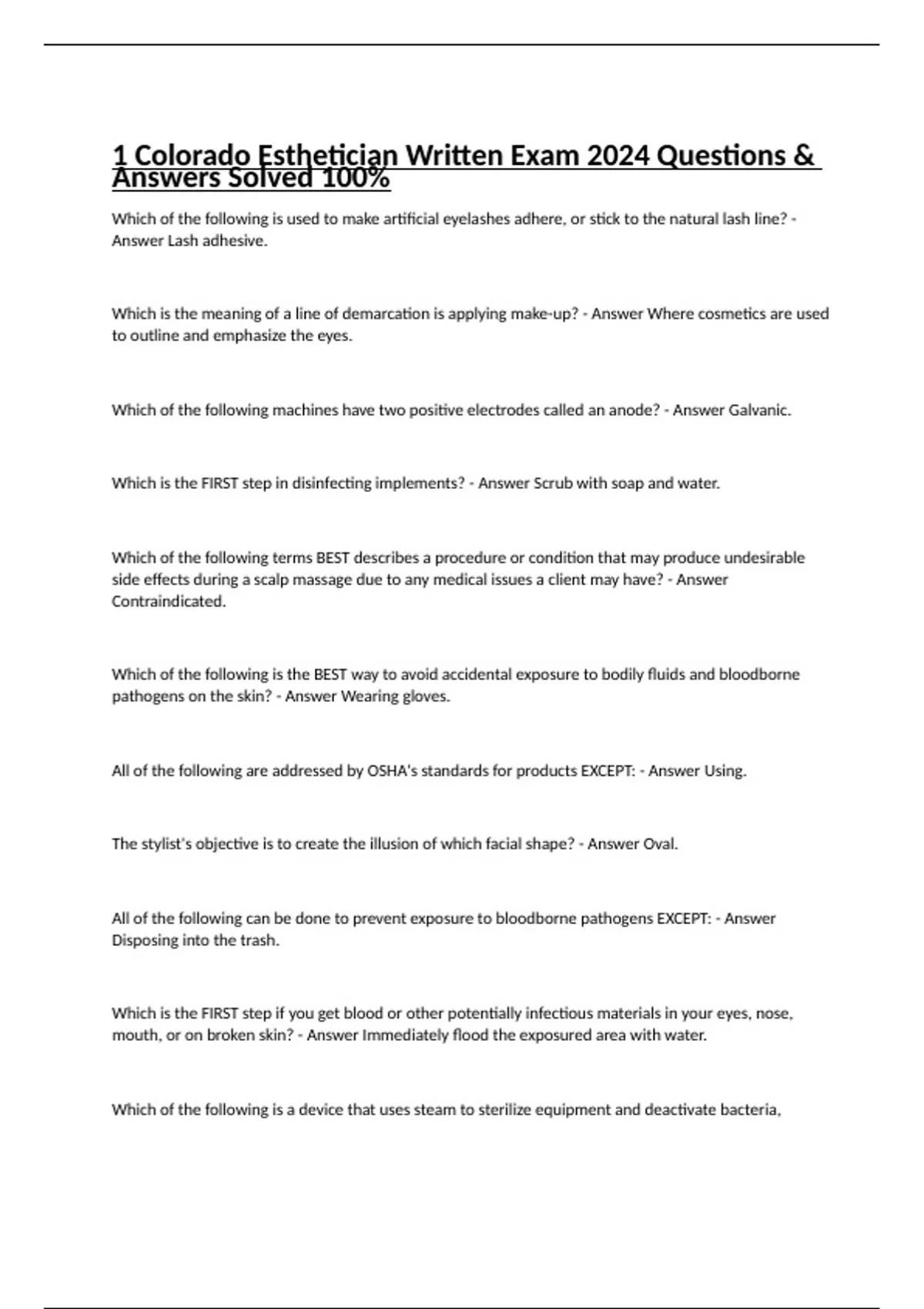 1 Colorado Esthetician Written Exam 2024 Questions & Answers Solved 100%
