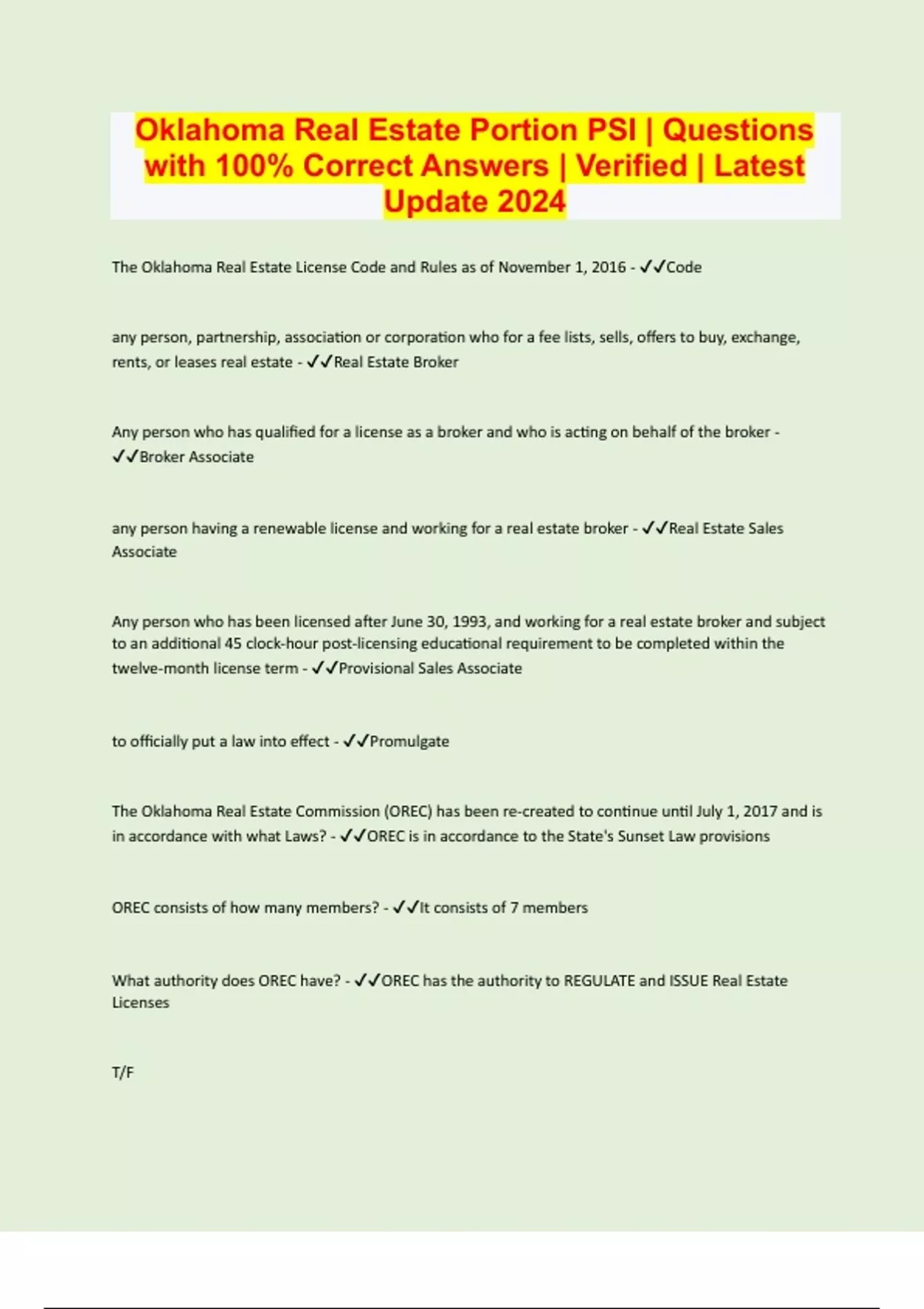 Oklahoma Real Estate Portion PSI | Questions with 100% Correct Answers | Verified | Latest Update 2024