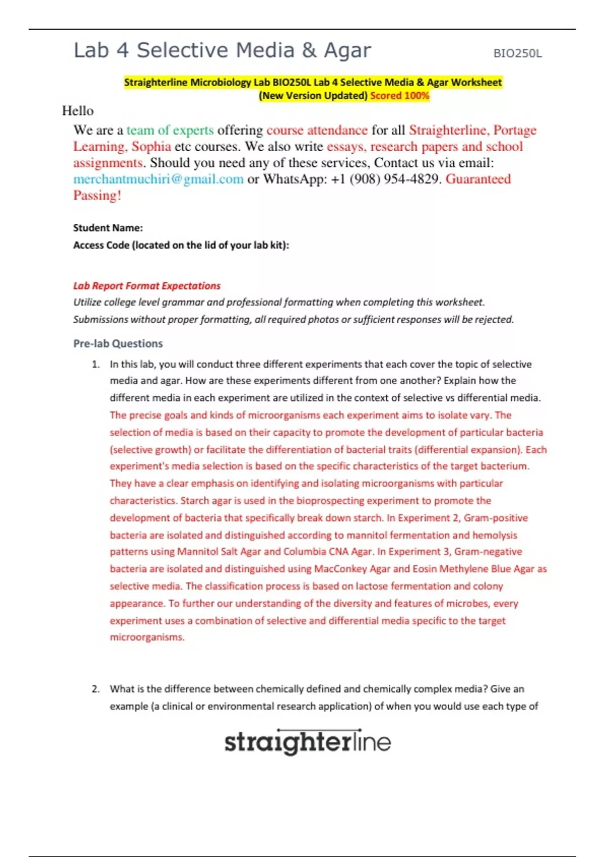 Straighterline Microbiology Lab BIO250L Lab 4 Selective Media & Agar Worksheet (New Version Updated) Scored 100%