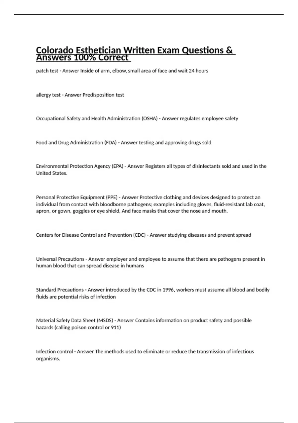 Safety cleansing and disinfection EPA - Answer Disinfectants, safe, and effective MSDS (Material Safety Data Sheet) - Answer Contains beneficial ingredients and possible hazards of the product OSHA (Occupational Safety and Health Administration) - Answer Regulates and enforces safety and health standards for work place An example of personal hygiene is - Answer Cleaning/cutting finger nails A contagious disease - Answer Can be spread from one person to another person A client has sores around the lips, mouth what should you do - Answer Refer to a physician After disinfected metal implement should be kept in - Answer Enclosed container After disinfected metal implement should be placed on - Answer Clean towel to dry Antiseptic - Answer Cleans and controls growth of bacteria Universal precaution - Answer Infection control Clean metal implements with - Answer Soap and warm water While working on a client, the client bleeding what do you do - Answer Stop working, put on gloves, and wait for bleeding to stop Never put electrodes in - Answer Autoclave Client come showing symptoms or sign of infection - Answer Symptomatic Capable of destroying bacteria except - Answer Pesticidal Bacteria that causes harm are classified as - Answer Pathogenic If client having athlete's foot the licensee not treat because - Answer Tinea pedis A product or object has microorganisms is - Answer Contaminated Remove of pathogens and other substances on tools is - Answer Decontamination The most effective of disinfectants is - Answer Disinfection The first level of decontamination is - Answer Sanitation The lowest level of disinfectants is - Answer Sanitation The esthetician should refer the client go to doctor or physician with signs of - Answer Pus Single use items are referred to as - Answer Disposable Tuberculocidal - Answer Hospital strength disinfectant Salon disinfectant - Answer Quats, 70% alcohol, bleach Pus - forming bacteria that grow in cluster like a bunch of grapes, causes abscesses, pustules and boils - Answer Staph All implement tools should be placed in - Answer Labeled plastic cover A client's allergic reaction to an ingredient in product - Answer Overexposure Before working on a client, an esthetician is required to - Answer Wash hands with soap and water Use the chemical to destroy pathogens - Answer Disinfecting Using a clean application bottle or placing product into smaller container are always to avoid - Answer Cross contamination Bacteria are most likely to grow in an environment that is - Answer Damp Which of the chemical is banned by the FDA - Answer Liquid methyl methacrylate (MMA) The lancets, razors, all shaves shall be disposed in a puncture resistant container - Answer Biohazards All reusable implements must be disinfected in - Answer Bleach Which of the following statement best describes beacteria - Answer Bacteria can be found in the air If blood spill occurs, floors and counters affected by the blood should be cleaned with - Answer Tuberculocodial disinfectant Tinea - Answer Fungal infection How do you treat a client with tinea - Answer Refer to the physician The primary purpose of salon ventilation is to - Answer Clear dangerous chemicals from the air Disinfection kills all organisms excepts - Answer Bacteria spores Wear gloves and glasses when you are mixing - Answer Disinfectants When immerse implements in quats, the amount of time is - Answer 10 minutes The infection control that destroys all organisms, including bacterial spores - Answer Sterilization What is the safety for antiseptic of hydrogen peroxide - Answer 3% What kind of chemical is used to clean skin in beauty salon - Answer Hydrogen peroxide In beauty salon cleaning floor, toilet, sink, doorknob, which chemical is used - Answer Germicide All electrodes need disinfect and wipes with damp cotton containing - Answer Alcohol What is the most immediate way to obtain information about combustion level of product - Answer Read material safety data sheet Colorado barber and cosmetologist office requires to renew the business licensee every - Answer 2 years A signed document stating that client agrees to specific service and accepts all possibilities - Answer Informed consent or release form Discussing client outcomes for procedure - Answer A client consultation or intake form If a client becomes injured or hurt during a service, what should the licensee do - Answer Legally be held responsible All of the following are acceptable behaviors except - Answer Showing favoritism to higher pay clients What is an example of unethical behavior for a cosmetologist - Answer Ask the client to move to another salon Client is frowning and moving in facial chair - Answer Ask for discomfort The outermost lay of the skin - Answer Epidermis Live layer of connective tissue below the epidermis or true skin - Answer Dermis Located in dermis, these supply nourishment within the skin - Answer Lymph vessels Hair is made up of - Answer Keratin Hair, skin, and nails are part of the - Answer Integumentary system Protein fiber produced by fibroblasts are - Answer Collagen Defense mechanism in skin to protect it from the sun is - Answer Melanin Sudoriferous glands - Answer Produce sweat Ascorbic acid - Answer Vitamin C