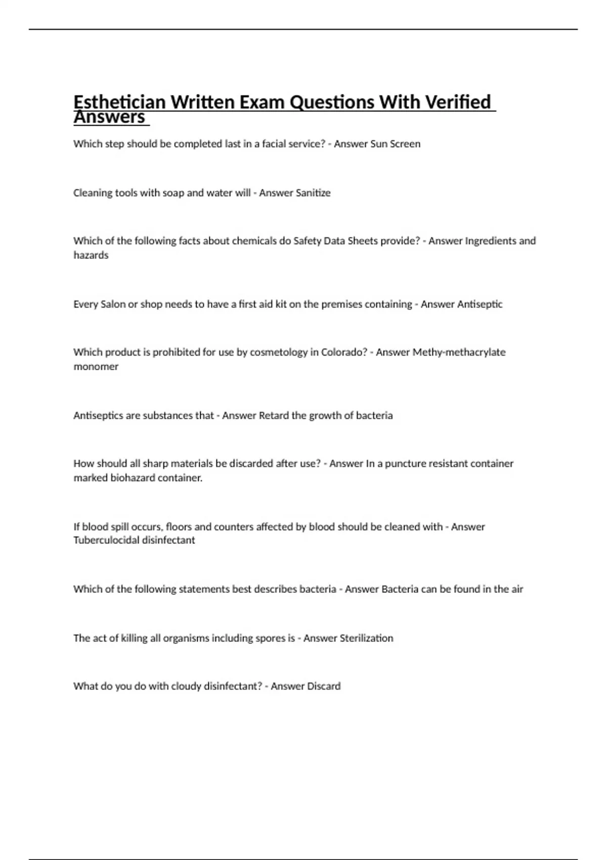 Which step should be completed last in a facial service? - Answer Sun Screen Cleaning tools with soap and water will - Answer Sanitize Which of the following facts about chemicals do Safety Data Sheets provide? - Answer Ingredients and hazards Every Salon or shop needs to have a first aid kit on the premises containing - Answer Antiseptic Which product is prohibited for use by cosmetology in Colorado? - Answer Methy-methacrylate monomer Antiseptics are substances that - Answer Retard the growth of bacteria How should all sharp materials be discarded after use? - Answer In a puncture resistant container marked biohazard container. If blood spill occurs, floors and counters affected by blood should be cleaned with - Answer Tuberculocidal disinfectant Which of the following statements best describes bacteria - Answer Bacteria can be found in the air The act of killing all organisms including spores is - Answer Sterilization What do you do with cloudy disinfectant? - Answer Discard Which of the following represents the MOST effective form of decontamination? - Answer Sanitation The PRIMARY purpose of salon ventilation is to - Answer Clean dangerous chemical from the air What is the MOST immediate way to obtain information about combustion levels of a product - Answer Read the SDS The first step that should be performed in order to sanitize implements is - Answer Washing the implements with soap and warm water When mixing disinfectants containing bleach or alcohol, it is REQUIRED to - Answer Record the date Disinfectant MUST have a registration number and be approved by the - Answer Environment Protection Agency A basic facial starts with - Answer Cleansing When applying a mask, start at - Answer The neck Which massage manipulation is often used to begin and end massage treatments? - Answer Effleurage During a massage, what effect does effleurage give? - Answer Soothing and relaxing Which of the following is a makeup product that makes the eyes look bigger? - Answer Eyeliner After wax is applied, the wax is removed - Answer In the opposite direction of hair growth When applying powder and blush, what kind of brush should you use? - Answer Powder brush Vacuum suction should not be used on clients with - Answer Dry skin Products that are anti-aging and hydrated the skin promote - Answer Reduced wrinkles Facial massages - Answer Increase circulation If the licensee has a cut or abrasion, what should they do to protect themselves and their client from infection? - Answer Wear gloves Using EPA in a beauty salon to clean floor, toilet, sink, and doorknob is an example of? - Answer Disinfection Permanent makeup needs special training certificate for how long? - Answer 132hrs How many hours of training is required for cosmetologist and esthetician's to do exfoliating? - Answer 24hrs Authorization to use microdermabrasion requires how many hours of training? - Answer 14hrs