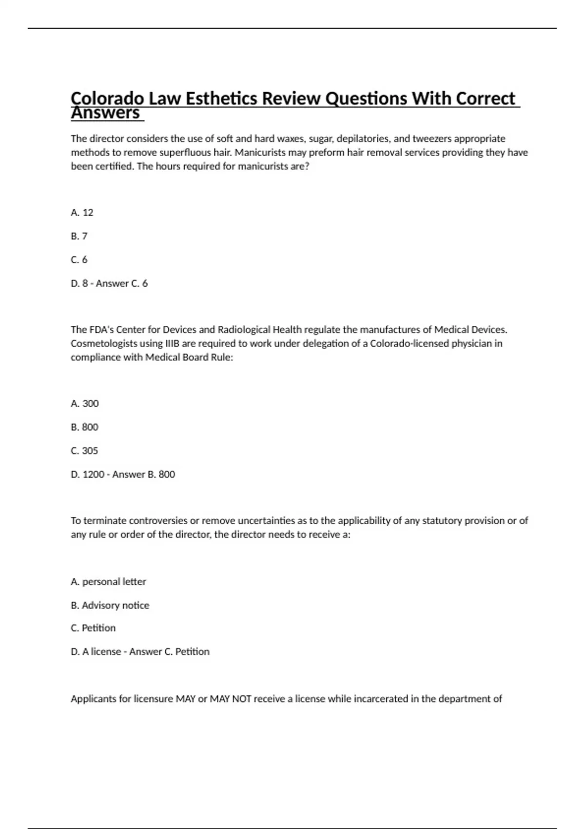The director considers the use of soft and hard waxes, sugar, depilatories, and tweezers appropriate methods to remove superfluous hair. Manicurists may preform hair removal services providing they have been certified. The hours required for manicurists are? A. 12 B. 7 C. 6 D. 8 - Answer C. 6 The FDA's Center for Devices and Radiological Health regulate the manufactures of Medical Devices. Cosmetologists using IIIB are required to work under delegation of a Colorado-licensed physician in compliance with Medical Board Rule: A. 300 B. 800 C. 305 D. 1200 - Answer B. 800 To terminate controversies or remove uncertainties as to the applicability of any statutory provision or of any rule or order of the director, the director needs to receive a: A. personal letter B. Advisory notice C. Petition D. A license - Answer C. Petition Applicants for licensure MAY or MAY NOT receive a license while incarcerated in the department of corrections. - Answer MAY NOT In the event of a State Inspector issues a violation notice to registrants or licensees, the notice must remain: A. Posted in public view B. In the state office C. Posted in private area D. Salon window - Answer A. Posted in public view The FDA has approved certain color additives for lash and brow tinting. True or False - Answer False An Estheticians license includes chemical/mechanical peels, microdermabrasion, and permeant makeup. True or False - Answer False Chemical and/or manual resurfacing exfoliating's procedures are: A. Allowed at the same time B. Never allowed C. Not allowed at the same time D. Always done together - Answer C. Not allowed at the same time The waiting period for resurfacing procedures after plastic surgery is? A. 1 week B. 5 weeks C. 2 weeks D. 6 weeks - Answer C. 6 weeks How many hours of cosmeceutical coursework are required for and esthetician/ cosmetologist to provide chemical resurfacing services in the salon? A. 24 B. 10 C. 32 D. 132 - Answer A. 24 Ultraviolet light boxes for disinfection are: A. Permitted B. Legal C. Prohibited D. Illegal - Answer C. Prohibited Salon owners or licensees using or storing products/devices that have been banned or deemed unsafe will be considered ______________ evidence. A. Prima facie B. Unnecessary C. Obvious D. Unacceptable - Answer A. Prima facie To reduce the risk of infection, any area on the clients skin must be _________ prior to waxing. A. Unclean B. Disinfected C. Shaved D. Cleaned - Answer D. Cleaned Liquid foundation must be dispensed with a pump style bottle or removed from container without the mouth of the container touching? A. The container B. sponge C. The client D. Licensee - Answer D. Licensee Wet towel must be prepared and replaced: A. Weekly B. Monthly C. Hourly D. Daily - Answer D. Daily Towel warmers must be disinfected daily and left ____________ overnight. A. Closed B. On C. Open D. Off - Answer C. Open Written authorization is required before servicing after a client has had __________ condition involving swelling, eruption, redness, bruising, open wounds or sores. A. Communicable/ contagious B. Reoccurring C. Questionable D. Favorable - Answer A. Communicable/ contagious Tools and implements must not be placed on? A. In pockets B. In holster's C. On un-clean surfaces D. All of the above - Answer D. All of the above Disinfected items must be stored in a clean, covered container labeled: A. Disinfected, clean or ready to use B. Prepared C. Washed D. Organized - Answer A. Disinfected, clean or ready to use All sharp objects, including lancets, and razors must be disposed of in a puncture resistant container: A. Daily B. Monthly C. Weekly D. Immediately after use - Answer D. Immediately after use Disinfectants are considered poisonous and caustic, and should be stored: A. In the reception room B. In work areas C. On labeled shelving D. In areas not open to the public - Answer D. In areas not open to the public Soiled linens should be stored in: A. Trash bags B. Closed receptacle C. Covered and ventilated laundry baskets D. Open containers - Answer C. Covered and ventilated laundry baskets Trash containers must have solid sides, a lid, and lined with a plastic bag. If container is stored in a cabinet, or closed area, the can: A. Doesn't require a bag B. Doesn't require a lid C. Doesn't require cleaning D. Doesn't require cleaning - Answer B. Doesn't require a lid A hand sanitizer that contains 70%alchol needs an exposure time of: A. 30 seconds B. 3 minutes C. 60 seconds D. 6 minutes - Answer A. 30 seconds Equipment not suitable for disinfection of non-porous items: A. Dry sanitizer B. Ultraviolet box C. Microwave D. All of the above - Answer D. All of the above Make up pencils need to be sharpened prior to: A. The day of the service B. Storing C. Each use D. Disinfecting - Answer C. Each use