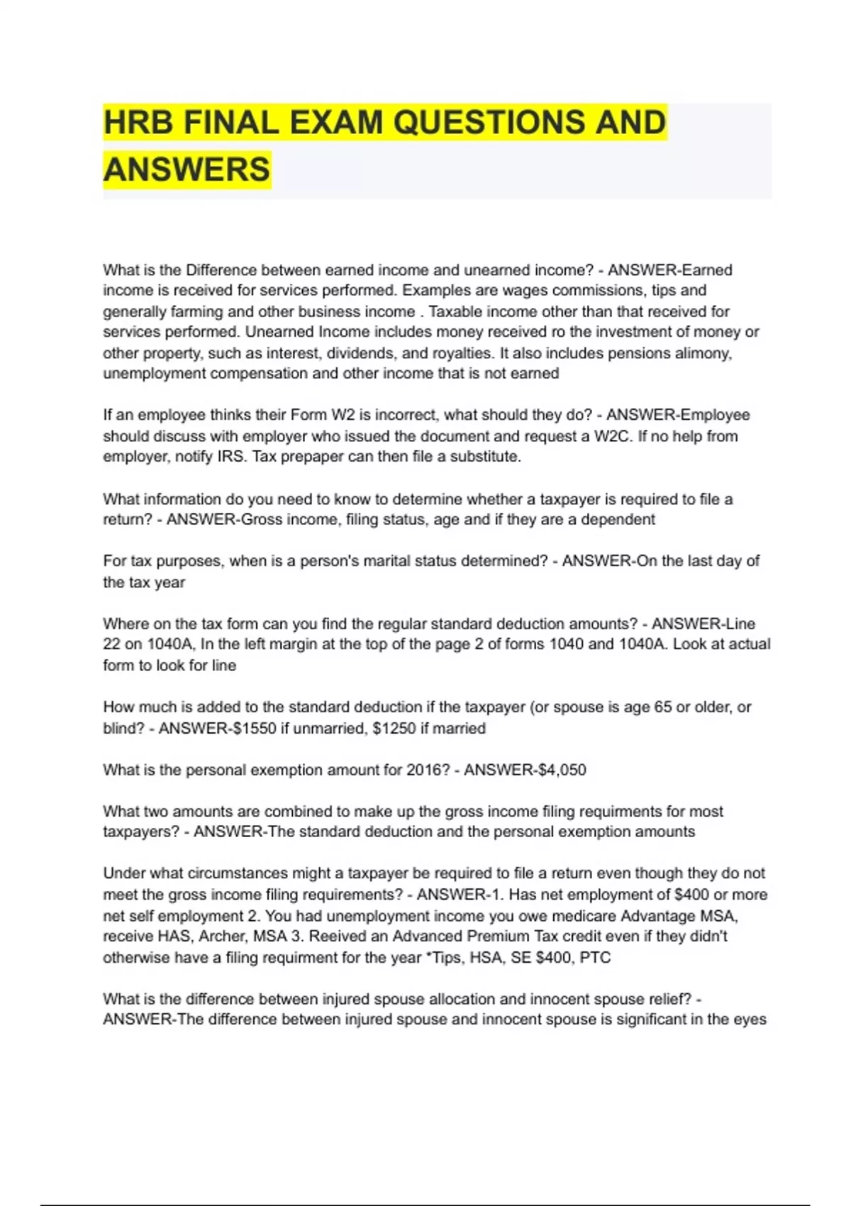 - HRB FINL EXM QUESIONS AND ANWERS