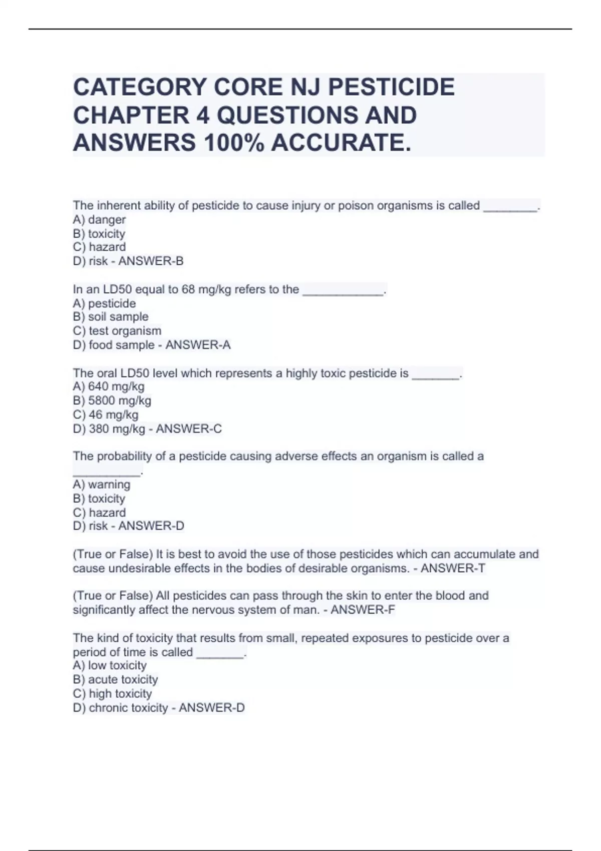 The inherent ability of pesticide to cause injury or poison organisms is called ________. A) danger B) toxicity C) hazard D) risk - ANSWER-B In an LD50 equal to 68 mg/kg refers to the ____________. A) pesticide B) soil sample C) test organism D) food sample - ANSWER-A The oral LD50 level which represents a highly toxic pesticide is _______. A) 640 mg/kg B) 5800 mg/kg C) 46 mg/kg D) 380 mg/kg - ANSWER-C The probability of a pesticide causing adverse effects an organism is called a __________. A) warning B) toxicity C) hazard D) risk - ANSWER-D (True or False) It is best to avoid the use of those pesticides which can accumulate and cause undesirable effects in the bodies of desirable organisms. - ANSWER-T (True or False) All pesticides can pass through the skin to enter the blood and significantly affect the nervous system of man. - ANSWER-F The kind of toxicity that results from small, repeated exposures to pesticide over a period of time is called _______. A) low toxicity B) acute toxicity C) high toxicity D) chronic toxicity - ANSWER-D The signal word on a pesticide label indicates the pesticide's ____________. A) effectiveness B) toxicity C) compatibility D) formulation - ANSWER-B (True or False) Low toxicity is indicated by low LD50. - ANSWER-F (True or False) The acute toxicity is a measure of how harmful or poisonous a pesticide is to an animal or man from a single exposure. - ANSWER-T The hazard of a pesticide is ______________. A) the same as its toxicity B) its inherent danger C) indicated by signal words on the label - ANSWER-B (True or False) The systems of pesticide poisoning are greatly different from those of other types of poisoning and/or illnesses. - ANSWER-F After an acute, dermal exposure to a moderately or highly toxic pesticide, the first think to do is _______. A) remove the contaminated clothing and shower B) drink plenty of water C) vomit if possible D) finish spraying and go immediately to the house - ANSWER-A General symptoms of pesticide poisoning can be ______. A) headache and dizziness B) nausea and diarrhea C) e