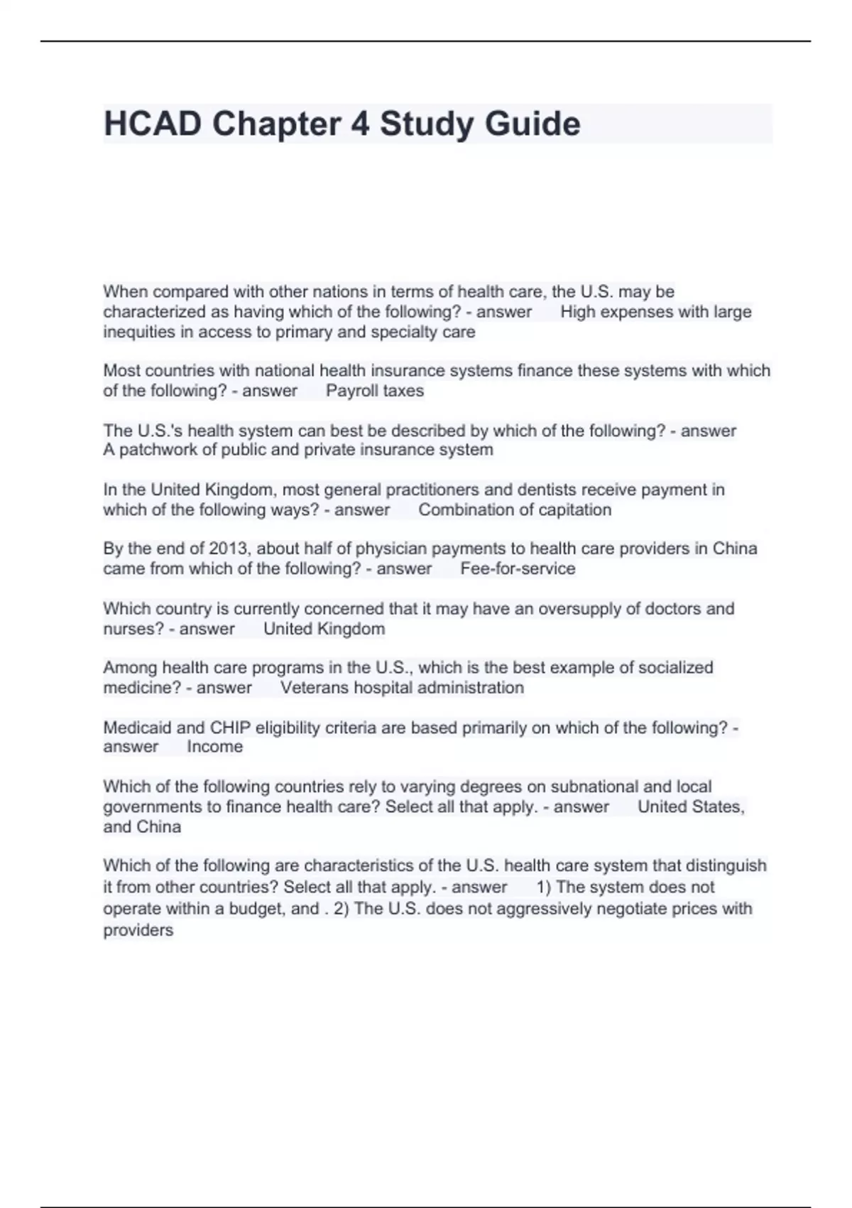 HCAD Chapter 4 Study Guide Questions with correct Answers 2024