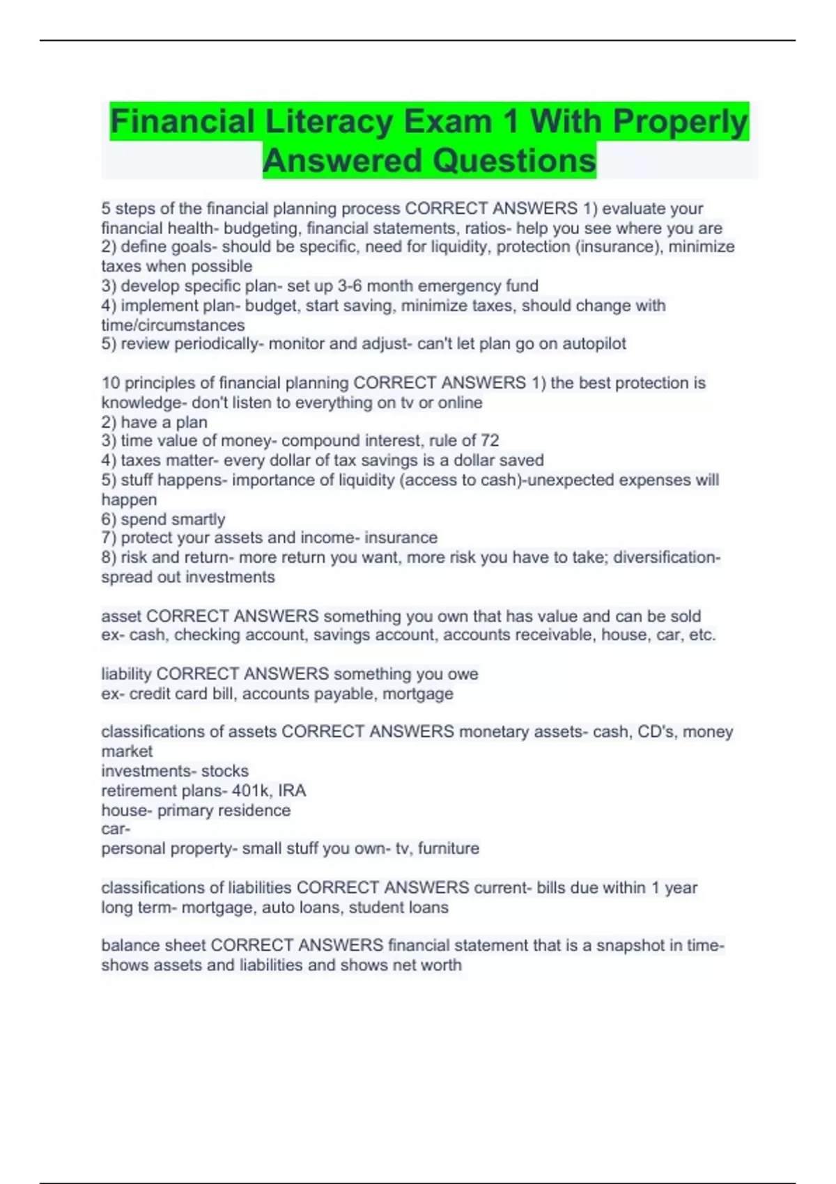 Financial Literacy Exam 1 With Properly Answered Questions