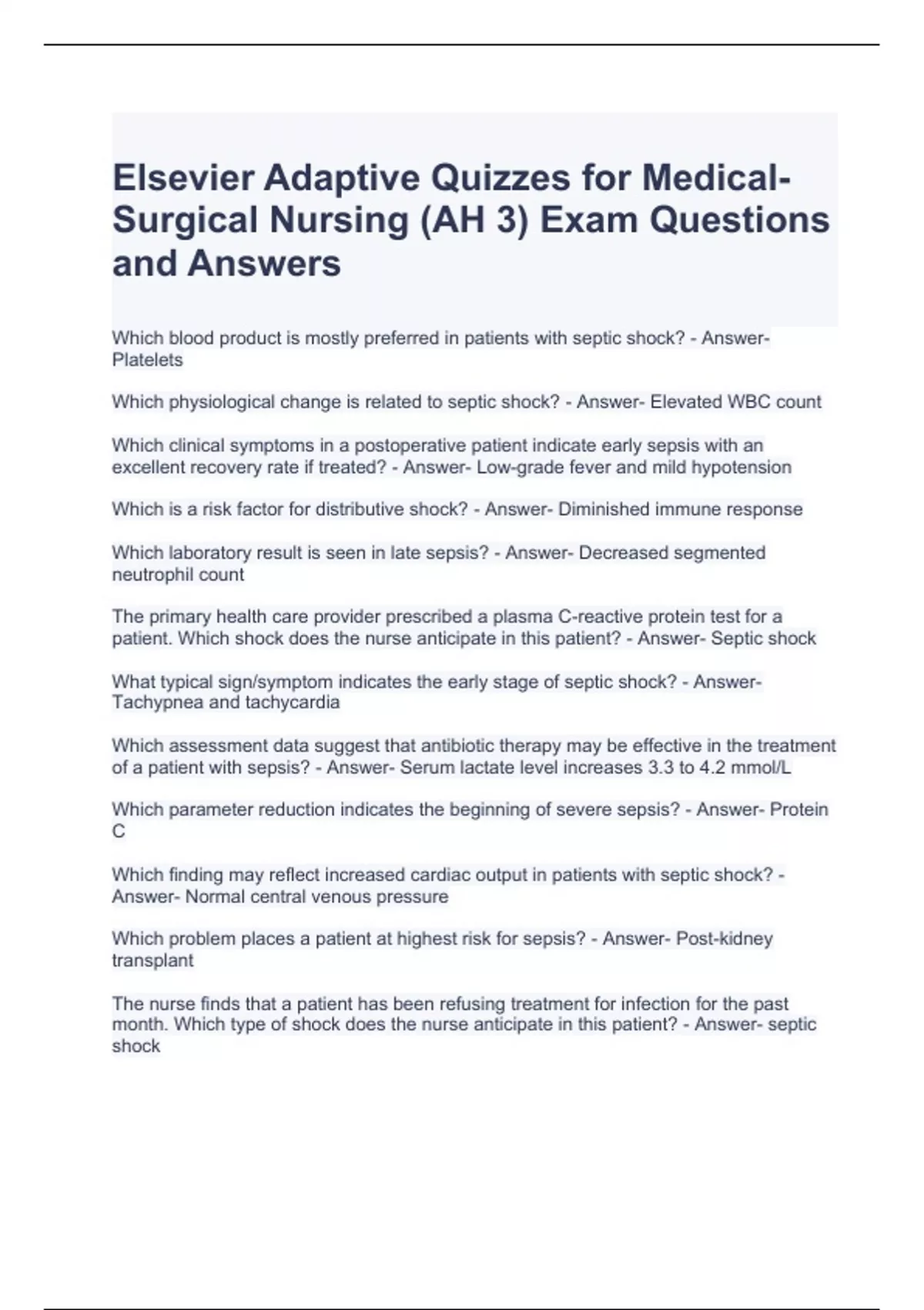 Elsevier Adaptive Quizzes for Medical-Surgical Nursing (AH 3) Exam Questions and Answers