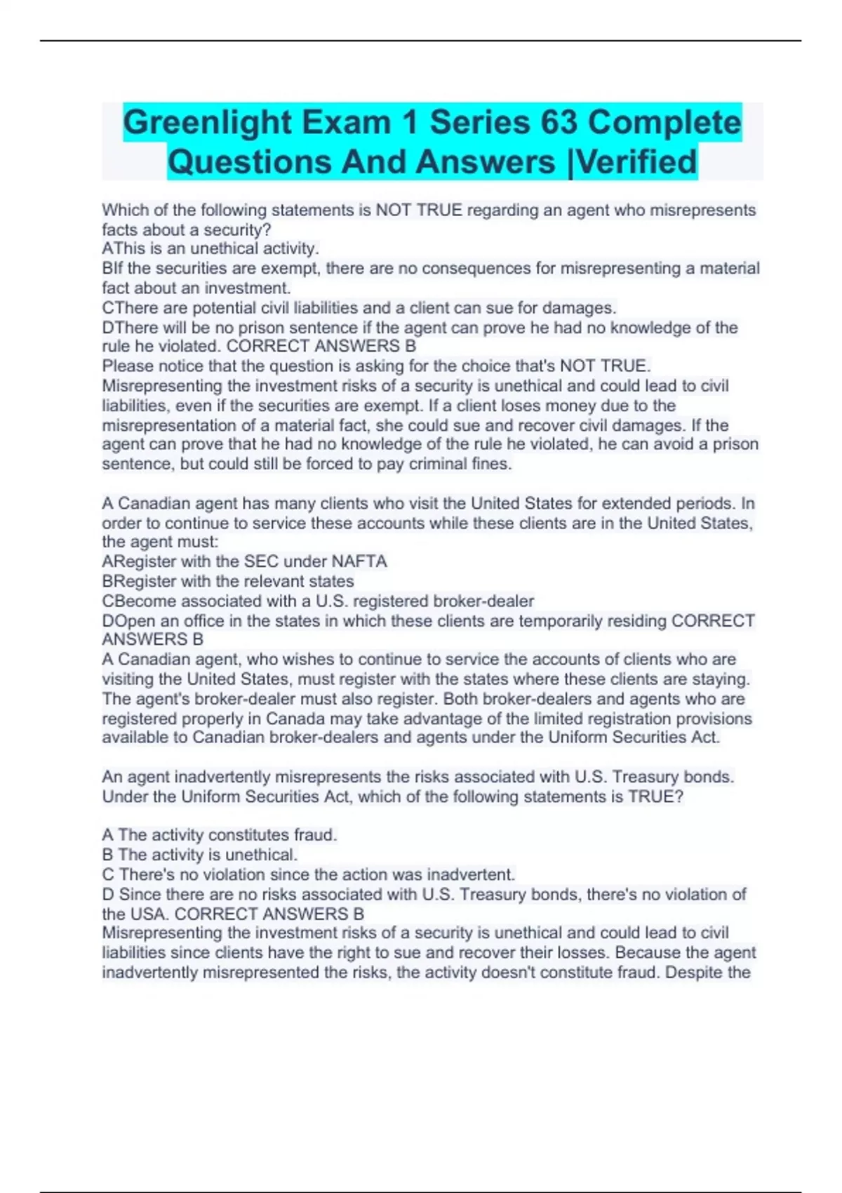 Greenlight Exam 1 Series 63 Complete Questions And Answers