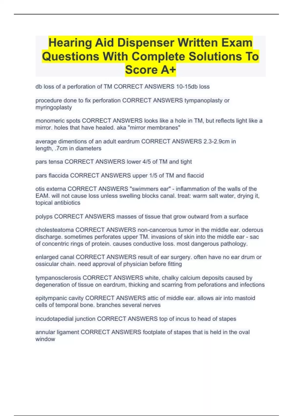 Hearing Aid Dispenser Written Exam Questions With Complete Solutions To Score A