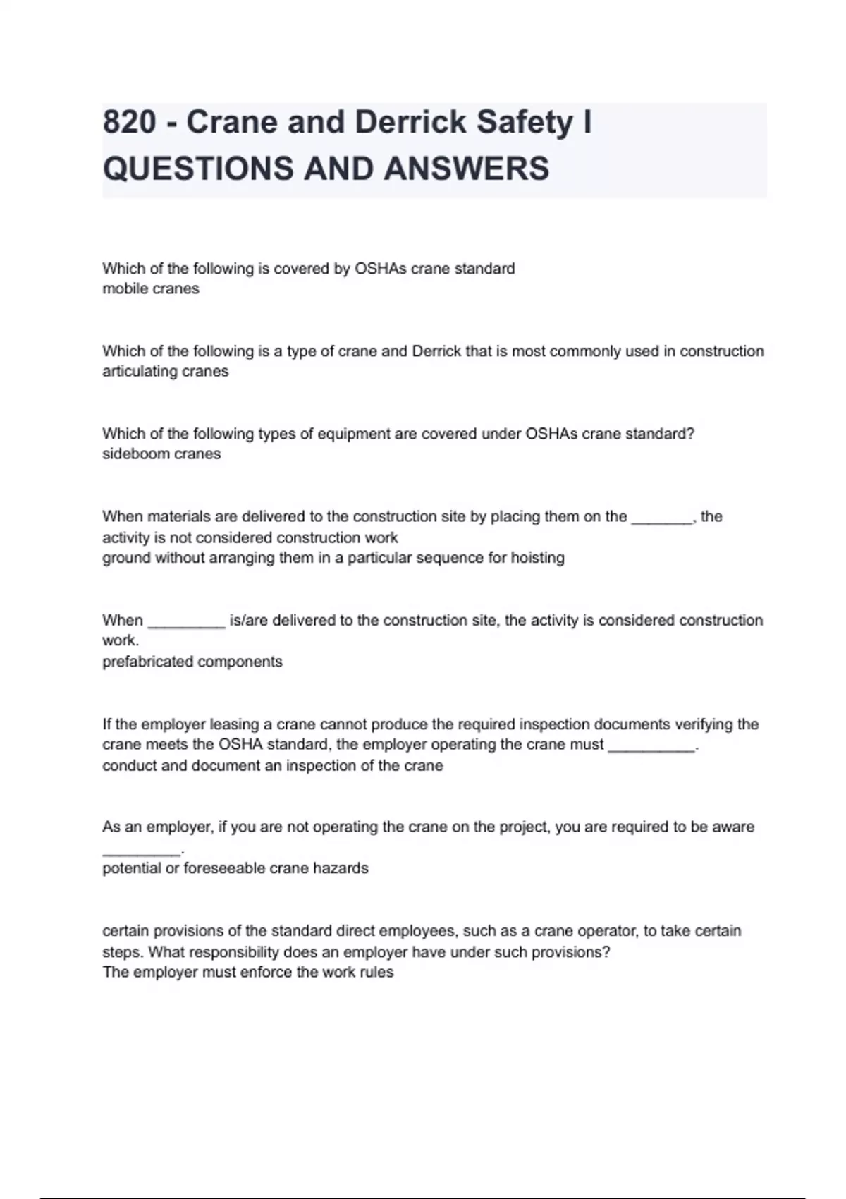 820 - Crane and Derrick Safety I QUESTIONS AND ANSWERS