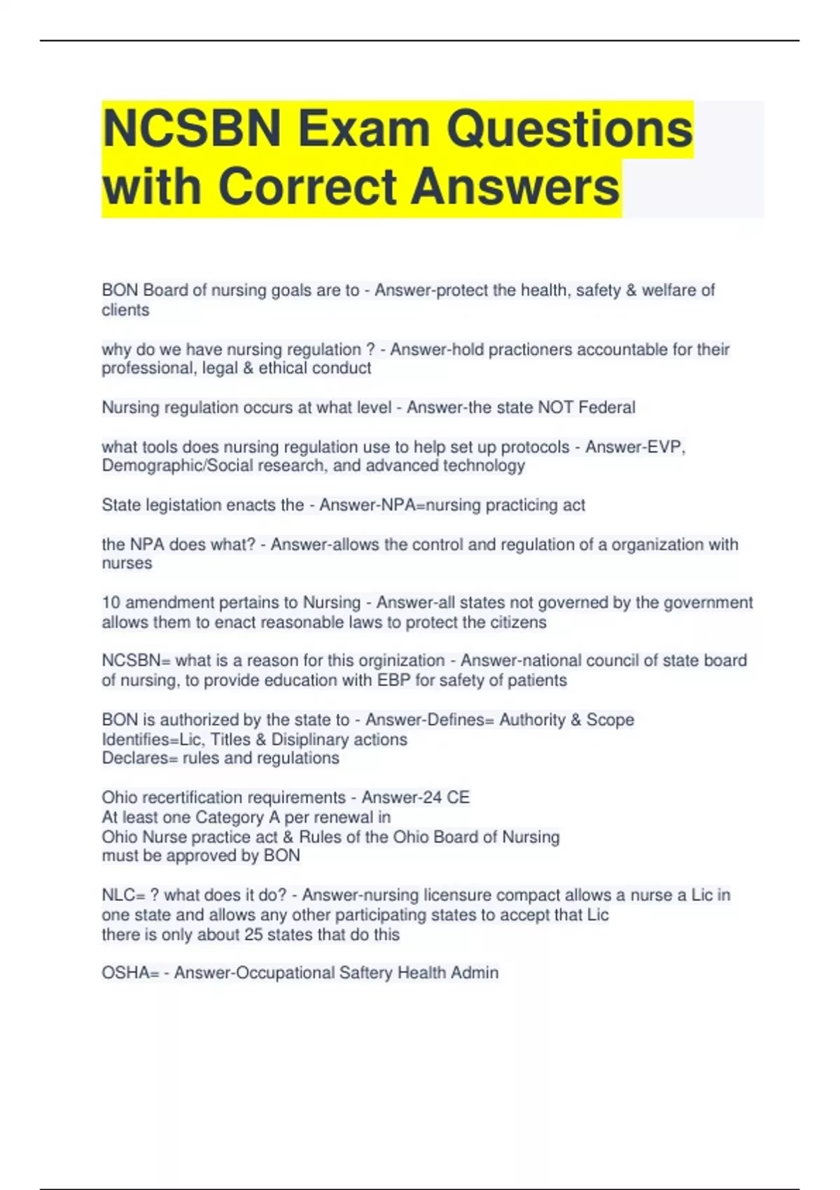 NCSBN Exam Questions with Correct Answers BON Board of nursing goals are to - Answer-protect the health, safety & welfare of clients why do we have nursing regulation ? - Answer-hold practioners accountable for their professional, legal & ethical conduct Nursing regulation occurs at what level - Answer-the state NOT Federal what tools does nursing regulation use to help set up protocols - Answer-EVP, Demographic/Social research, and advanced technology State legistation enacts the - Answer-NPA=nursing practicing act the NPA does what? - Answer-allows the control and regulation of a organization with nurses 10 amendment pertains to Nursing - Answer-all states not governed by the government allows them to enact reasonable laws to protect the citizens NCSBN= what is a reason for this orginization - Answer-national council of state board of nursing, to provide education with EBP for safety of patients BON is authorized by the state to - Answer-Defines= Authority & Scope Identifies=Lic, Titles & Disiplinary actions Declares= rules and regulations Ohio recertification requirements - Answer-24 CE At least one Category A per renewal in Ohio Nurse practice act & Rules of the Ohio Board of Nursing must be approved by BON