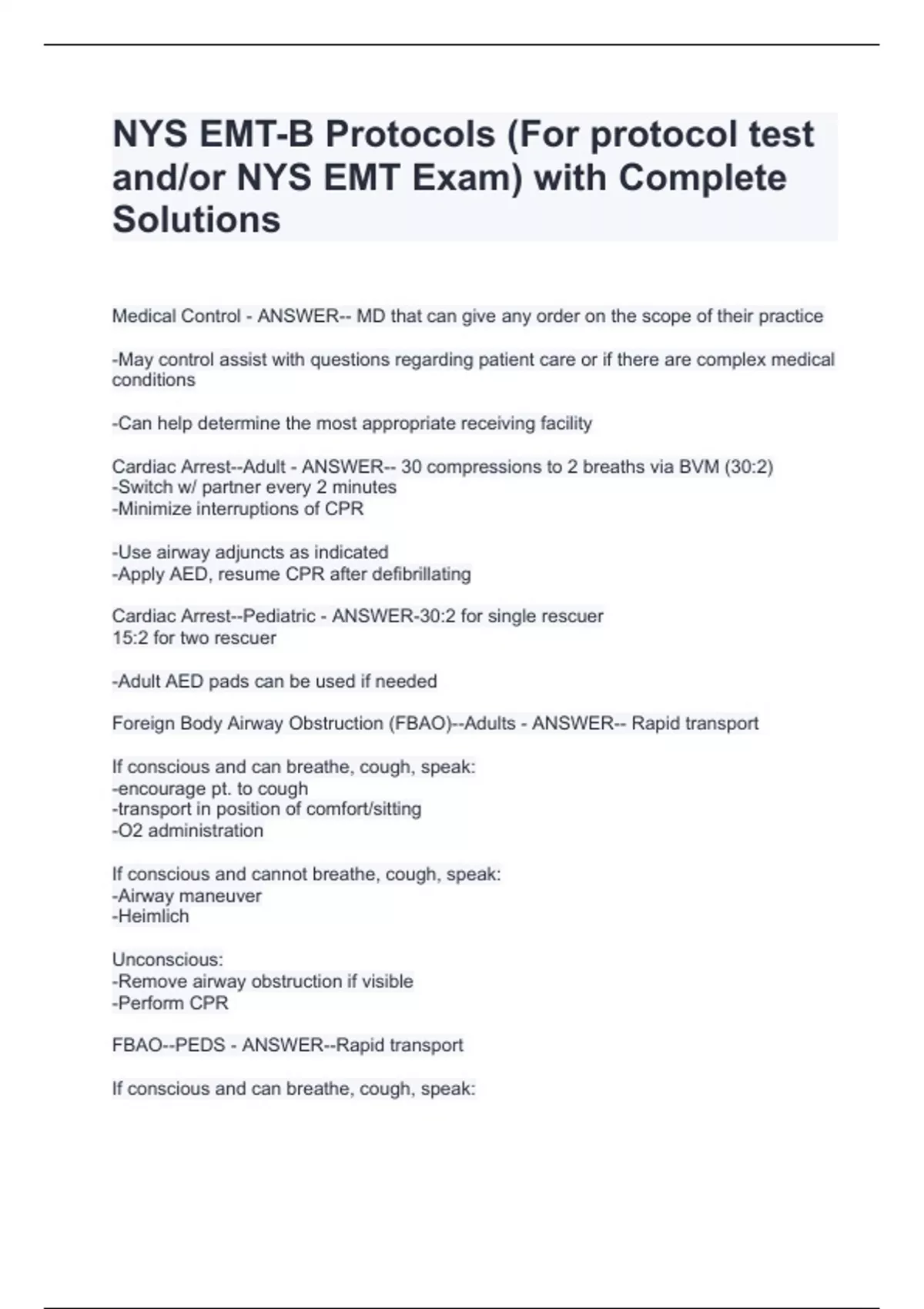 NYS EMT-B Protocols (For protocol test and/or NYS EMT Exam) with Complete SolutionsNYS EMT-B Protocols (For protocol test and/or NYS EMT Exam) with Complete SolutionsNYS EMT-B Protocols (For protocol test and/or NYS EMT Exam) with Complete Solutions Medical Control - ANSWER-- MD that can give any order on the scope of their practice -May control assist with questions regarding patient care or if there are complex medical conditions -Can help determine the most appropriate receiving facility Cardiac Arrest--Adult - ANSWER-- 30 compressions to 2 breaths via BVM (30:2) -Switch w/ partner every 2 minutes