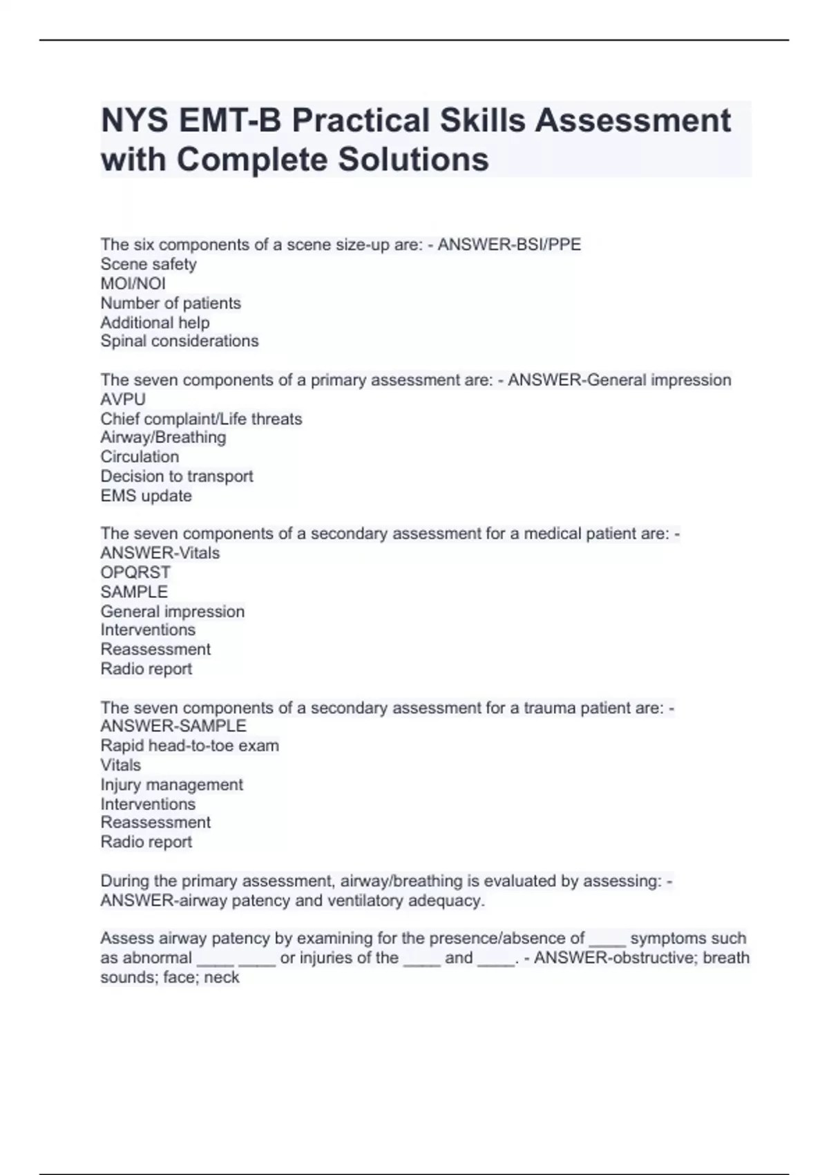 NYS EMT-B Practical Skills Assessment with Complete Solutions NYS EMT-B Practical Skills Assessment with Complete Solutions NYS EMT-B Practical Skills Assessment with Complete SolutionsThe six components of a scene size-up are: - ANSWER-BSI/PPE Scene safety MOI/NOI Number of patients Additional help Spinal considerations The seven components of a primary assessment are: - ANSWER-General impression AVPU Chief complaint/Life threats Airway/Breathing Circulation Decision to transport EMS update The seven components of a secondary assessment for a medical patient are: - ANSWER-Vitals OPQRST