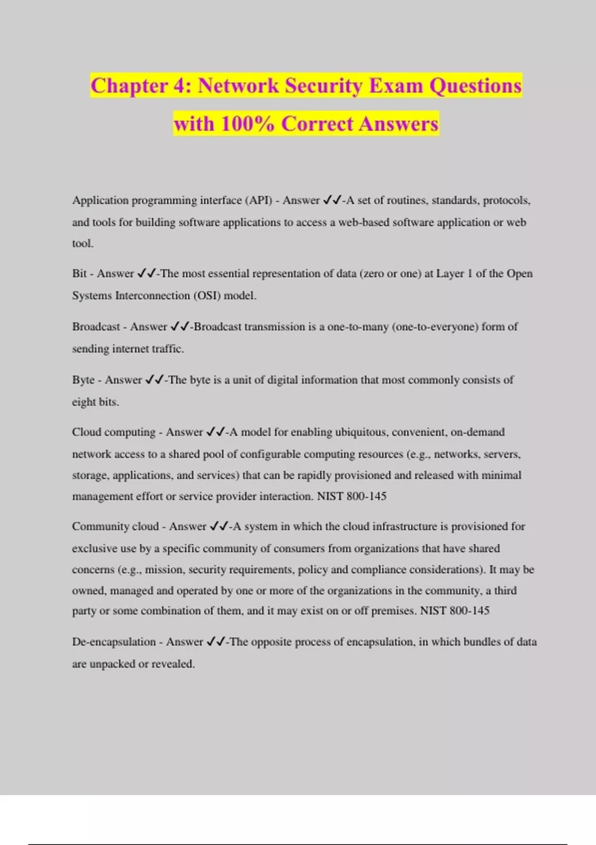 Chapter 4: Network Security Exam Questions with 100% Correct Answers Application programming interface (API) - Answer ️️ -A set of routines, standards, protocols, and tools for building software applications to access a web-based software application or web tool. Bit - Answer ️️ -The most essential representation of data (zero or one) at Layer 1 of the Open Systems Interconnection (OSI) model. Broadcast - Answer ️️ -Broadcast transmission is a one-to-many (one-to-everyone) form of sending internet traffic. Byte - Answer ️️ -The byte is a unit of digital information that most commonly consists of eight bits. Cloud computing - Answer ️️ -A model for enabling ubiquitous, convenient, on-demand network access to a shared pool of configurable computing resources (e.g., networks, servers, storage, applications, and services) that can be rapidly provisioned and released with minimal management effort or service provider interaction. NIST 800-145 Community cloud - Answer ️️ -A system in which the cloud infrastructure is provisioned for exclusive use by a specific community of consumers from organizations that have shared concerns (e.g., mission, security requirements, policy and compliance considerations). It may be owned, managed and operated by one or more of the organizations in the community, a third party or some combination of them, and it may exist on or off premises. NIST 800-145 De-encapsulation - Answer ️️ -The opposite process of encapsulation, in which bundles of data are unpacked or revealed. Denial-of-Service (DoS) - Answer ️️ -The prevention of authorized access to resources or the delaying of time-critical operations. (Time-critical may be milliseconds or it may be hours, depending upon the service provided.) Source: NIST SP 800-27 Rev A Domain Name Service (DNS) - Answer ️️ -This acronym can be applied to three interrelated elements: a service, a physical server and a network protocol. Encapsulation - Answer ️️ -Enforcement of data hiding and code hiding during all phases of software development and operational use. Bundling together data and methods is the process of encapsulation; its opposite process may be called unpacking, revealing, or using other terms. Also used to refer to taking any set of data and packaging it or hiding it in another data structure, as is common in network protocols and encryption. Encryption - Answer ️️ -The process and act of converting the message from its plaintext to ciphertext. Sometimes it is also referred to as enciphering. The two terms are sometimes used interchangeably in literature and have similar meanings. File Transfer Protocol (FTP) - Answer ️️ -The internet protocol (and program) used to transfer files between ho
