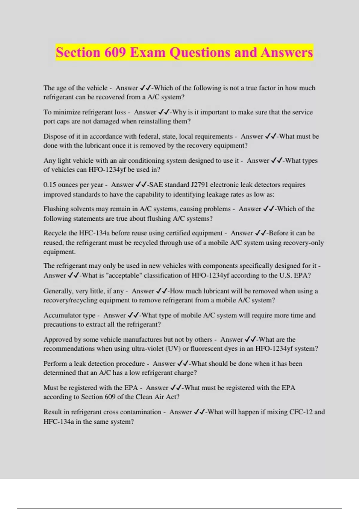 Section 609 Exam Questions and Answers The age of the vehicle - Answer ️️ -Which of the following is not a true factor in how much refrigerant can be recovered from a A/C system? To minimize refrigerant loss - Answer ️️ -Why is it important to make sure that the service port caps are not damaged when reinstalling them? Dispose of it in accordance with federal, state, local requirements - Answer ️️ -What must be done with the lubricant once it is removed by the recovery equipment? Any light vehicle with an air conditioning system designed to use it - Answer ️️ -What types of vehicles can HFO-1234yf be used in? 0.15 ounces per year - Answer ️️ -SAE standard J2791 electronic leak detectors requires improved standards to have the capability to identifying leakage rates as low as: Flushing solvents may remain in A/C systems, causing problems - Answer ️️ -Which of the following statements are true about flushing A/C systems? Recycle the HFC-134a before reuse using certified equipment - Answer ️️ -Before it can be reused, the refrigerant must be recycled through use of a mobile A/C system using recovery-only equipment. The refrigerant may