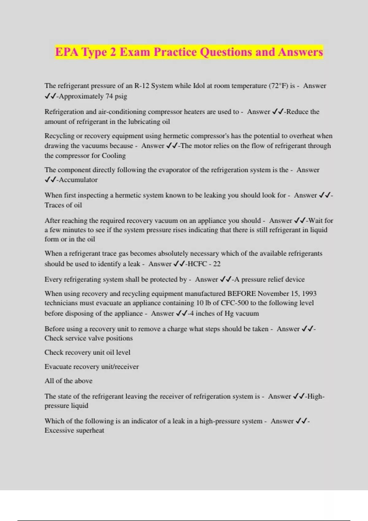 EPA Type 2 Exam Practice Questions and Answers The refrigerant pressure of an R-12 System while Idol at room temperature (72°F) is - Answer ️️ -Approximately 74 psig Refrigeration and air-conditioning compressor heaters are used to - Answer ️️ -Reduce the amount of refrigerant in the lubricating oil Recycling or recovery equipment using hermetic compressor's has the potential to overheat when drawing the vacuums because - Answer ️️ -The motor relies on the flow of refrigerant through the compressor for Cooling The component directly following the evaporator of the refrigeration system is the - Answer ️️ -Accumulator When first inspecting a hermetic system known to be leaking you should look for - Answer ️️ - Traces of oil After reaching the required recovery vacuum on an appliance you should - Answer ️️ -Wait for a few minutes to see if the system pressure rises indicating that there is still refrigerant in liquid form or in the oil When a refrigerant trace gas becomes absolutely necessary which of the available refrigerants should be used to identify a leak - Answer ️️ -HCFC - 22 Every refrigerating system shall be protected by - Answer ️️ -A pressure relief device When using recovery and recycling equipment manufactured BEFORE November 15, 1993 technicians must evacuate an appliance containing 10 lb of CFC-500 to the following level before disposing of the appliance - Answer ️️ -4 inches of Hg vacuum Before using a recovery unit to remove a charge what steps should be taken - Answer ️️ - Check service valve positions Check recovery unit oil level Evacuate recovery unit/receiver All of the above The state of the refrigerant leaving the receiver of refrigeration system is - Answer ️️ -High- pressure liquid Which of the following is an indicator of a leak in a high-pressure system - Answer ️️ - Excessive superheat Back seating a suction shut off valve will close - Answer ️️ -Gauge port During evacuation with large amounts of moisture it may be necessary to increase pressure to counteract freezing with gas such as - Answer ️️ -Nitrogen Refrigerant has been recovered from an air conditioning system and held in a refillable cylinder in order to replace the condenser coil the refrigerant - Answer ️️ -Can probably be charged back into the system In order to recover liquid refrigerant you must connect one hose to the systems - Answer ️️ - Liquid line When evacuating a vapor compression system the vacuum pump should be capable of pulling a vacuum of - Answer ️️ -500 microns Liquid charging of an R-12refrigeration system with risk of freezing is begun with vapor from a vacuum level to a pressure of approximately - Answer ️️ -33