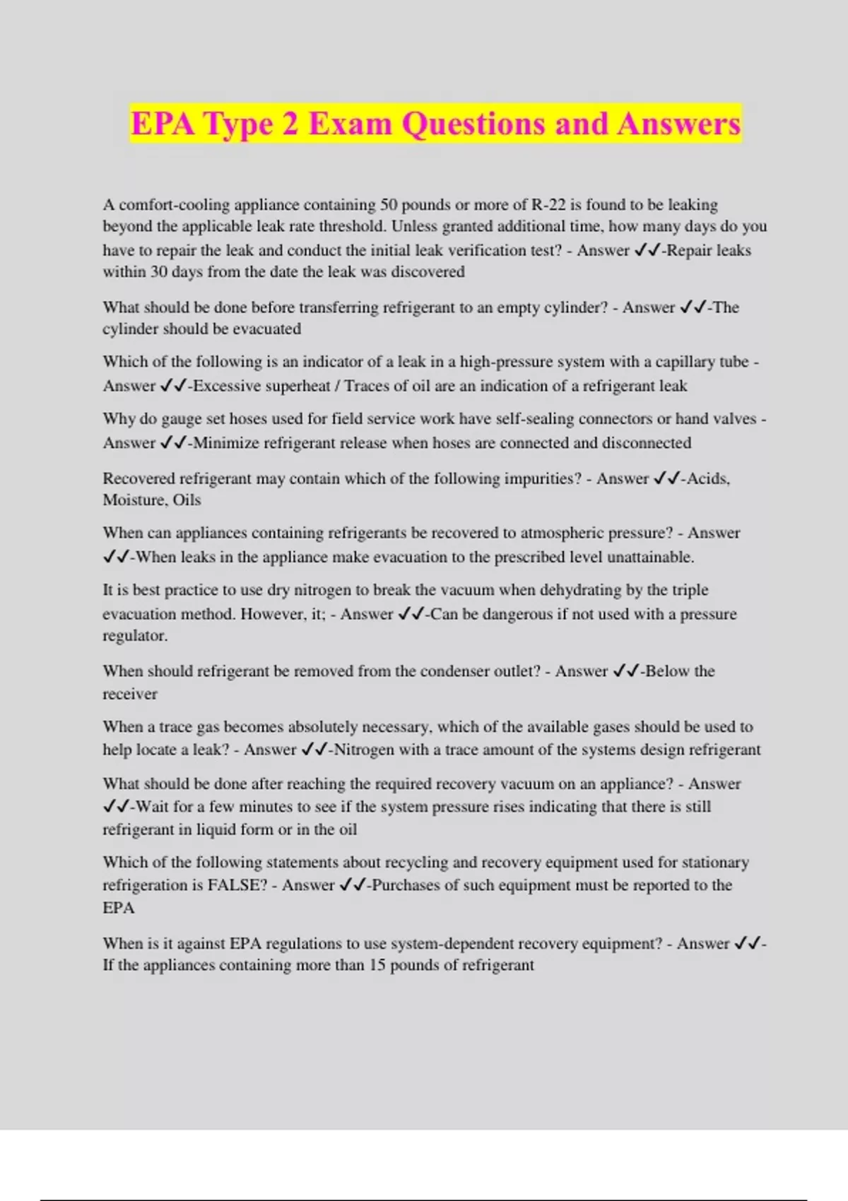 EPA Type 2 Exam Questions and Answers A comfort-cooling appliance containing 50 pounds or more of R-22 is found to be leaking beyond the applicable leak rate threshold. Unless granted additional time, how many days do you have to repair the leak and conduct the initial leak verification test? - Answer ️️ -Repair leaks within 30 days from the date the leak was discovered What should be done before transferring refrigerant to an empty cylinder? - Answer ️️ -The cylinder should be evacuated Which of the following is an indicator of a leak in a high-pressure system with a capillary tube - Answer ️️ -Excessive superheat / Traces of oil are an indication of a refrigerant leak Why do gauge set hoses used for field service work have self-sealing connectors or hand valves - Answer ️️ -Minimize refrigerant release when hoses are connected and disconnected Recovered refrigerant may contain which of the following impurities? - Answer ️️ -Acids, Moisture, Oils When can appliances containing refrigerants be recovered to atmospheric pressure? - Answer ️️ -When leaks in the appliance make evacuation to the prescribed level unattainable. It is best practice to use dry nitrogen to break the vacuum when dehydrating by the triple evacuation method. However, it; - Answer ️️ -Can be dangerous if not used with a pressure regulator. When should refrigerant be removed from the condenser outlet? - Answer ️️ -Below the receiver When a trace gas becomes absolutely necessary, which of the available gases should be used to help locate a leak? - Answer ️️ -Nitrogen with a trace amount of the systems design refrigeran