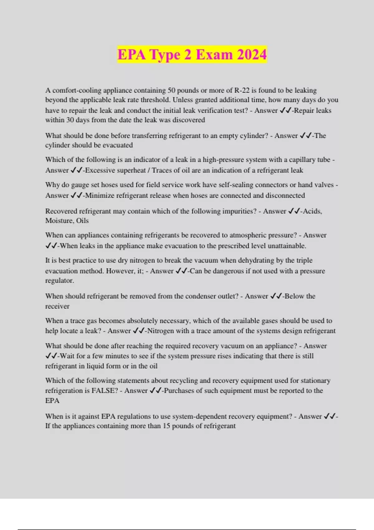 EPA Type 2 Exam 2024 A comfort-cooling appliance containing 50 pounds or more of R-22 is found to be leaking beyond the applicable leak rate threshold. Unless granted additional time, how many days do you have to repair the leak and conduct the initial leak verification test? - Answer ️️ -Repair leaks within 30 days from the date the leak was discovered What should be done before transferring refrigerant to an empty cylinder? - Answer ️️ -The cylinder should be evacuated Which of the following is an indicator of a leak in a high-pressure system with a capillary tube - Answer ️️ -Excessive superheat / Traces of oil are an indication of a refrigerant leak Why do gauge set hoses used for field service work have self-sealing connectors or hand valves - Answer ️️ -Minimize refrigerant release when hoses are connected and disconnected Recovered refrigerant may contain which of the following impurities? - Answer ️️ -Acids, Moisture, Oils When can appliances containing refrigerants be recovered to atmospheric pressure? - Answer ️️ -When leaks in the appliance make evacuation to the prescribed level unattainable. It is best practice to use dry nitrogen to break the vacuum when dehydrating by the triple evacuation method. However, it; - Answer ️️ -Can be dangerous if not used with a pressure regulator. When should refrigerant be removed from the condenser outlet? - Answer ️️ -Below the receiver When a trace gas becomes absolutely necessary, which of the available gases should be used to help locate a leak? - Answer ️️ -Nitrogen with a trace amount of the systems design refrigerant What should be done after reaching the required recovery vacuum on an appliance? - Answer ️️ -Wait for a few minutes to see if the system pressure rises indicating that there is still refrigerant in liquid form or in the oil Which of the following statements about recycling and recovery equipment used for stationary refrigeration is FALSE? - Answer ️️ -Purchases of such equipment must be reported to the EPA When is it against EPA regulations to use system-dependent recovery equipment? - Answer ️️ - If the appliances containing more than 15 pounds of refrigeran
