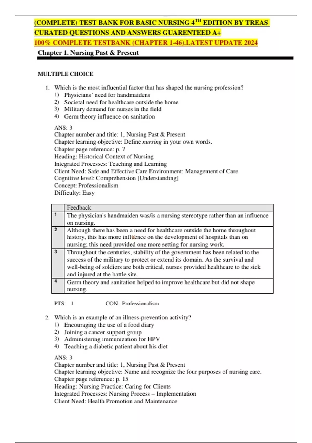 (COMPLETE) TEST BANK FOR BASIC NURSING 4TH EDITION BY TREAS CURATED QUESTIONS AND ANSWERS GUARENTEED A+ 100% COMPLETE TESTBANK (CHAPTER 1-46).LATEST UPDATE 2024 Chapter 1. Nursing Past & Present MULTIPLE CHOICE 1. Which is the most influential factor that has shaped the nursing profession? 1) Physicians’ need for handmaidens 2) Societal need for healthcare outside the home 3) Military demand for nurses in the field 4) Germ theory influence on sanitation ANS: 3 Chapter number and title: 1, Nursing Past & Present Chapter learning objective: Define nursing in your own words. Chapter page reference: p. 7 Heading: Historical Context of Nursing Integrated Processes: Teaching and Learning Client Need: Safe and Effective Care Environment: Management of Care Cognitive level: Comprehension [Understanding] Concept: Professionalism Difficulty: Easy Feedback 1 The physician's handmaiden was/is a nursing stereotype rather than an influence on nursing. 2 Although there has been a need for healthcare outside the home throughout history, this has more influNence on the development of hospitals than on nursing; this need provided one more setting for nursing work. 3 Throughout the centuries, stability of the government has been related to the success of the military to protect or extend its domain. As the survival and well-being of soldiers are both critical, nurses provided healthcare to the sick and injured at the battle site. 4 Germ theory and sanitation helped to improve healthcare but did not shape nursing. PTS: 1 CON: Professionalism 2. Which is an example of an illness-prevention activity? 1) Encouraging the use of a food diary 2) Joining a cancer support group 3) Administering immunization for HPV 4) Teaching a diabetic patient about his diet ANS: 3 Chapter number and title: 1, Nursing Past & Present Chapter learning objective: Name and recognize the four purposes of nursing care. Chapter page reference: p. 15 Heading: Nursing Practice: Caring for Clients Integrated Processes: Nursing Process – Implementation Client Need: Health Promotion and Maintenance Cognitive level: Application [Applying] Concept: Health Promotion Difficulty: Moderate Feedback 1 Illness-prevention activities focus on avoiding a specific disease. A food diary is a health-promotion activity. 2 Although cancer is a disease, it is assumed that a person joining a support group would already have the disease; therefore, this is not disease prevention but treatment. 3 Administering immunization for HPV is an example of illness prevention. 4 Teaching a diabetic patient about diet is a treatment for diabetes; the patient already has diabetes, so it cannot prevent diabetes. PTS: 1 CON: Health Promotion 3. Which contribution of Florence Nightingale had an immediate impact on improving patients’ health? 1) Providing a clean environment 2) Improving nursing education 3) Changing the delivery of care in hospitals 4) Establishing nursing as a distinct profession ANS: 1 Chapter number and title: 1, Nursing Past & Present Chapter learning objective: Name nine expanded roles for nursing. Chapter page reference: p. 9 Heading: Table 1-1 Roles and FNunctions of the Nurse Integrated Processes: Caring Client Need: Health Promotion and Maintenance Cognitive level: Comprehension [Understanding] Concept: Evidence-Based Practice Difficulty: Easy Feedback 1 Improved sanitation (a clean environment) greatly and immediately reduced the rate of infection and mortality in hospitals. 2 This is an activity of Florence Nightingale that improved healthcare or nursing, but the impact is long range, not immediate. 3 This is an activity of Florence Nightingale that improved healthcare or nursing, but the impact is long range, not immediate. 4 This is an activity of Florence Nightingale that improved healthcare or nursing, but the impact is long range, not immediate. PTS: 1 CON: Evidence-Based Practice 4. Which aspect of the full-spectrum nursing role is essential for the nurse to do in order to successfully carry out all the others? 1) Thinking and reasoning about the client’s care 2) Providing hands-on client care 3) Carrying out physician orders 4) Delegating to assistive personnel ANS: 1 Chapter number and title: 1, Nursing Past & Present Chapter learning objective: Name and recognize the four purposes of nursing care. Chapter page reference: p. 8 Heading: Nursing Today: Full-Spectrum Nursing Integrated Processes: Nursing Process Client Need: Safe and Effective Care Environment: Management of Care Cognitive level: Analysis [Analyzing] Concept: Patient-Centered Care Difficulty: Difficult Feedback 1 A substantial portion of the nursing role involves using clinical judgment, critical thinking, and problem solving, which directly affect the care the client will actually receive. 2 Providing hands-on care is important; however, clinical judgment, critical thinking, and problem-solving are essential to do it successfully. 3 Carrying out physician orders is a small part of a nurse’s role; it, too, requires nursing assessment, planning, intervention, and evaluation. 4 Many simple nursing tasks are being delegated to nursing assistive personnel; delegation requires careful analysis of patient status and the appropriateness of support personnel to deliver care. PTS: 1 CON: Patient-Centered Care 5. Which statement pertaining to NBenner’s practice model for clinical competence is true? 1) Progression through the stages is constant, with most nurses reaching the proficient stage. 2) Progression through the stages involves continual development of thinking and technical skills. 3) The nurse must have experience in many areas before being considered an expert. 4) The nurse’s progress through the stages is determined by years of experience and skills. ANS: 2 Chapter number and title: 1, Nursing Past & Present Chapter learning objective: Discuss the transitions nursing education has undergone in the last century. Chapter page reference: p. 12 Heading: Benner’s M