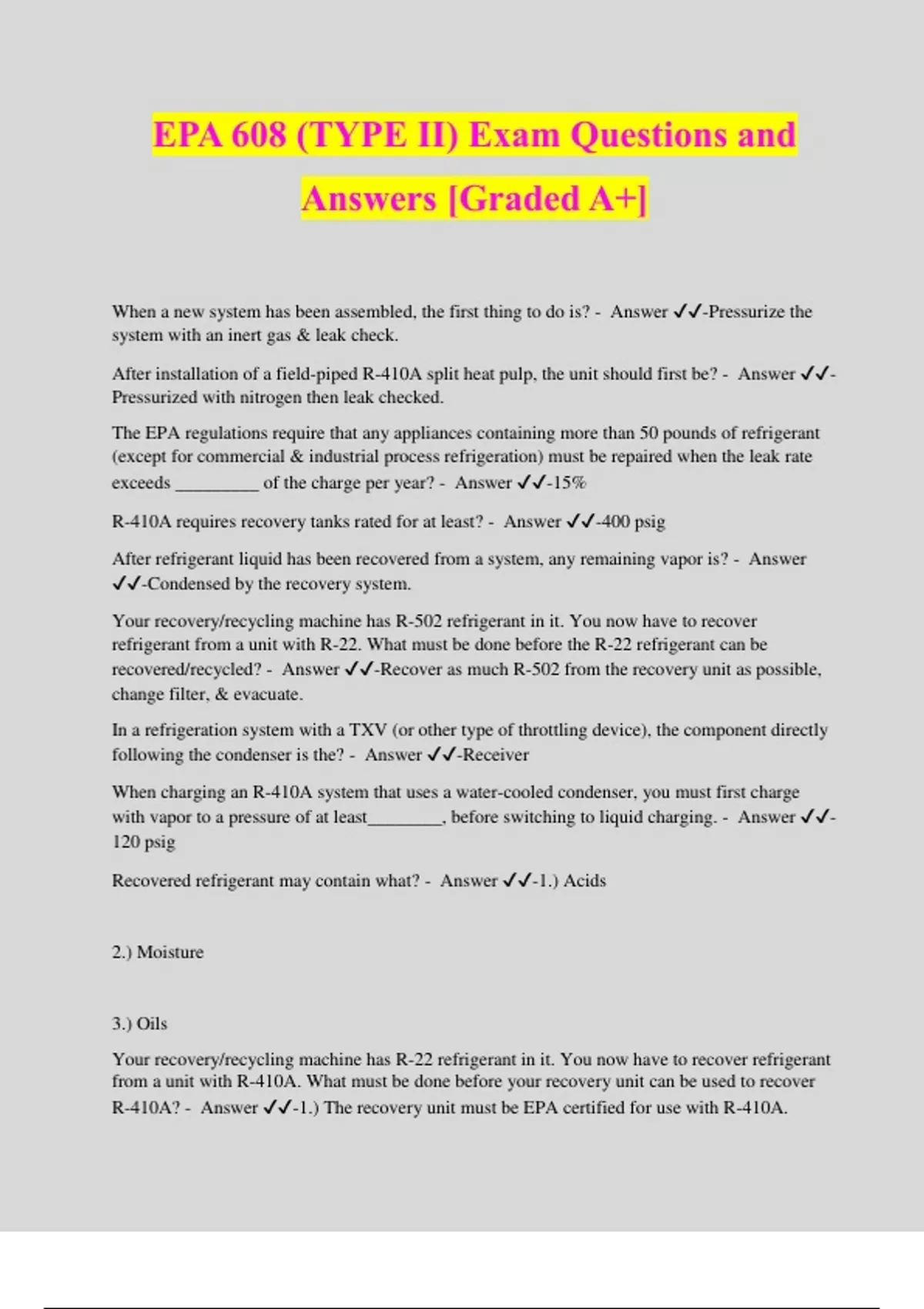 EPA 608 (TYPE II) Exam Questions and Answers [Graded A+] When a new system has been assembled, the first thing to do is? - Answer ️️ -Pressurize the system with an inert gas & leak check. After installation of a field-piped R-410A split heat pulp, the unit should first be? - Answer ️️ - Pressurized with nitrogen then leak checked. The EPA regulations require that any appliances containing more than 50 pounds of refrigerant (except for commercial & industrial process refrigeration) must be repaired when the leak rate exceeds _________ of the charge per year? - Answer ️️ -15% R-410A requires recovery tanks rated for at least? - Answer ️️ -400 psig After refrigerant liquid has been recovered from a system, any remaining vapor is? - Answer ️️ -Condensed by the recovery system. Your recovery/recycling machine has R-502 refrigerant in it. You now have to recover refrigerant from a unit with R-22. What must be done before the R-22 refrigerant can be recovered/recycled? - Answer ️️ -Recover as much R-502 from the recovery unit as possible, change filter, & evacuate. In a refrigeration system with a TXV (or other type of throttling device), the component directly following the condenser is the? - Answer ️️ -Receiver When charging an R-410A system that uses a water-cooled condenser, you must first charge with vapor to a pressure of at least________, before switching to liquid charging. - Answer ️️ - 120 psig Recovered refrigerant may contain what? - Answer ️️ -1.) Acids 2.) Moisture 3.) Oils Your recovery/recycling machine has R-22 refrigerant in it. You now have to recover refrigerant from a unit with R-410A. What must be done before your recovery unit can be used to recover R-410A? - Answer ️️ -1.) The recovery unit must be EPA certified for use with R-410A.