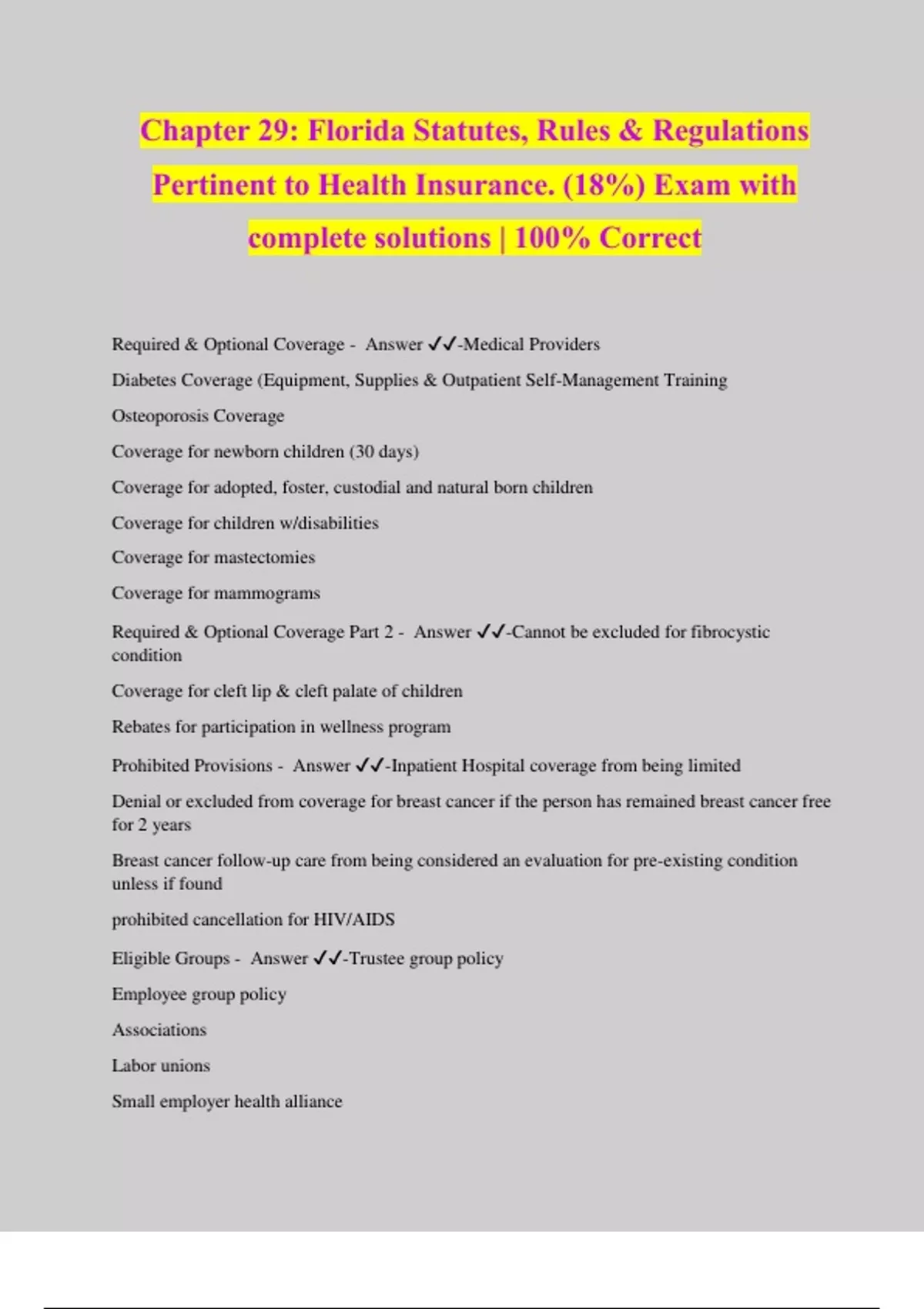 Chapter 29: Florida Statutes, Rules & Regulations Pertinent to Health Insurance. (18%) Exam with complete solutions | 100% Correct Required & Optional Coverage - Answer ️️ -Medical Providers Diabetes Coverage (Equipment, Supplies & Outpatient Self-Management Training Osteoporosis Coverage Coverage for newborn children (30 days) Coverage for adopted, foster, custodial and natural born children Coverage for children w/disabilities Coverage for mastectomies Coverage for mammograms Required & Optional Coverage Part 2 - Answer ️️ -Cannot be excluded for fibrocystic condition Coverage for cleft lip & cleft palate of children Rebates for participation in wellness program Prohibited Provisions - Answer ️️ -Inpatient Hospital coverage from being limited Denial or excluded from coverage for breast cancer if the person has remained breast cancer free for 2 years Breast cancer follow-up care from being considered an evaluation for pre-existing condition unless if found prohibited cancellation for HIV/AIDS Eligible Groups - Answer ️️ -Trustee group policy Employee group policy Associations Labor unions Small employer health alliance Debtor group policy Blanket Health Insurance Continuation - Answer ️️ -To ensure continued access to affordable health insurance coverage to employees of small employers and their dependents (Mini-COBRA) Conversion - Answer ️️ -To convert one policy to another Previous policy was terminated by employer for reasons other than lack of payment First premium must be paid no later than 63 days after termination. Coordination of Benefits - Answer ️️ -If the insured has 2 types of insurance they must both agree to cover the cost within an order Outline of Coverage - Answer ️️ -Completed and delivered to the applicant at the time of application Renewal Agreements/Nonrenewal and Cancellation - Answer ️️ -An insurer that provides individual or group health insurance coverage must renew the coverage at the option of the individual or group policyholder 90 days before date of nonrenewal by insurer. If a particular health insurance is discontinued 180 days notice before date of nonrenewal if discontinued in Florida (All plans) Advertising - Answer ️️ -Advertising materials must clearly indic