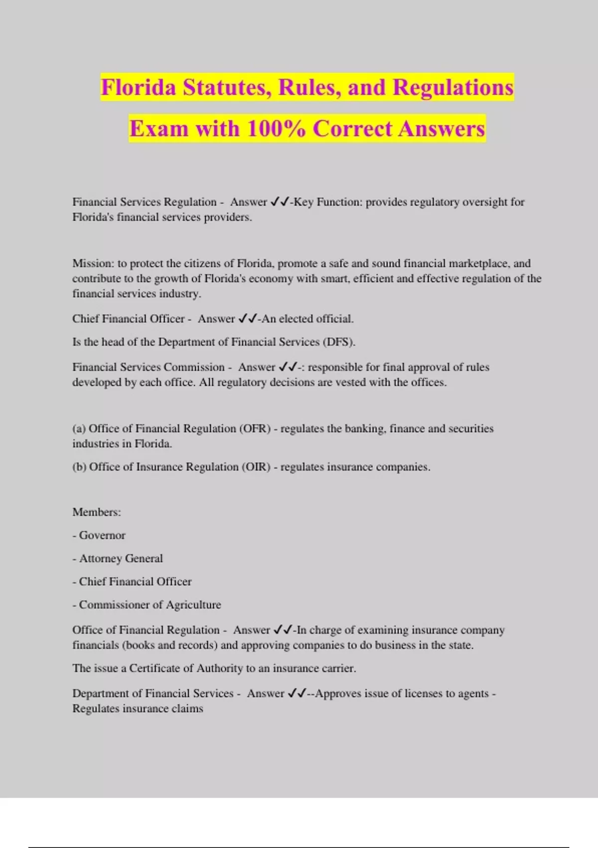 Florida Statutes, Rules, and Regulations Exam with 100% Correct Answers Financial Services Regulation - Answer ️️ -Key Function: provides regulatory oversight for Florida's financial services providers. Mission: to protect the citizens of Florida, promote a safe and sound financial marketplace, and contribute to the growth of Florida's economy with smart, efficient and effective regulation of the financial services industry. Chief Financial Officer - Answer ️️ -An elected official. Is the head of the Department of Financial Services (DFS). Financial Services Commission - Answer ️️ -: responsible for final approval of rules developed by each office. All regulatory decisions are vested with the offices. (a) Office of Financial Regulation (OFR) - regulates the banking, finance and securities industries in Florida. (b) Office of Insurance Regulation (OIR) - regulates insurance companies. Members: - Governor - Attorney General - Chief Financial Officer - Commissioner of Agriculture Office of Financial Regulation - Answer ️️ -In charge of examining insurance company financials (books and records) and approving companies to do business in the state. The issue a Certificate of Authority to an insurance carrier. Department of Financial Services - Answer ️️ --Approves issue of licenses to agents - Regulates insurance claims - Investigate allegations of ethics violations - Administers justice within the domain of insurance Agent and Adjuster licensing and investigations - Answer ️️ -Under the CFO, the DFS approves issue of licenses to agents, regulates insurance claims, investigates allegations of ethics violations, and administers justice within the domain of insurance. Insurance Fraud - Answer ️️ -is any act committed with the intent to obtain a fraudulent outcome from an insurance process. This may occur when a claimant attempts to obtain some benefit or advantage to which they are not otherwise entitled, or when an insurer knowingly denies some benefit that is due. Office of Insurance Regulation - Answer ️️ -The Commissioner of Insurance is in charge of the Office of Insurance Regulation (OIR). They are in charge of examining insurance company financials (books and records), and approving companies to do business in the state. In this regard, they issue a Certificate of Authority to an insurance carrier. Office of Financial Regulation - Answer ️️ -regulates the