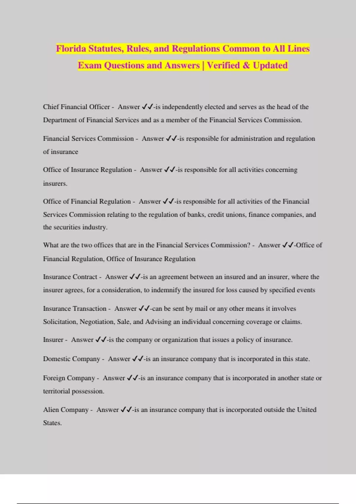Florida Statutes, Rules, and Regulations Common to All Lines Exam Questions and Answers | Verified & Updated Chief Financial Officer - Answer ️️ -is independently elected and serves as the head of the Department of Financial Services and as a member of the Financial Services Commission. Financial Services Commission - Answer ️️ -is responsible for administration and regulation of insurance Office of Insurance Regulation - Answer ️️ -is responsible for all activities concerning insurers. Office of Financial Regulation - Answer ️️ -is responsible for all activities of the Financial Services Commission relating to the regulation of banks, credit unions, finance companies, and the securities industry. What are the two offices that are in the Financial Services Commission? - Answer ️️ -Office of Financial Regulation, Office of Insurance Regulation Insurance Contract - Answer ️️ -is an agreement between an insured and an insurer, where the insurer agrees, for a consideration, to indemnify the insured for loss caused by specified events Insurance Transaction - Answer ️️ -can be sent by mail or any other means it involves Solicitation, Negotiation, Sale, and Advising an individual concerning coverage or claims. Insurer - Answer ️️ -is the company or organization that issues a policy of insurance. Domestic Company - Answer ️️ -is an insurance company that is incorporated in this state. Foreign Company - Answer ️️ -is an insurance company that is incorporated in another state or territorial possession. Alien Company - Answer ️️ -is an insurance company that is incorporated outside the United States. Reinsurance - Answer ️️ -is a contract under which one insurance company indemnifies another insurance company for part or all of its liabilities. Fraternals - Answer ️️ -is a benefit society that is an organization formed to provide insurance benefits for members of an affiliated lodge, religious organization, or fraternal organization with a representative form of government. Unauthorized/ Nonadmitted Companies - Answer ️️ -insurers who have not been approved to do business in the state. Authorized/ Admitted Companies - Answer ️️ -insurers who meet the state's financial requirements and are approved to transact business in the state (legal insurer) Stock Companies - Answer ️️ -are owned by stockholders who provide the capital necessary to establish and operate the insurance company and who s