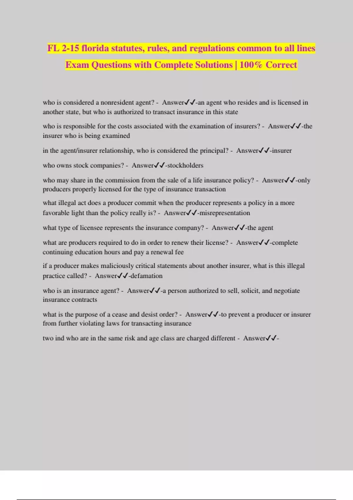 FL 2-15 florida statutes, rules, and regulations common to all lines Exam Questions with Complete Solutions | 100% Correct who is considered a nonresident agent? - Answer️️ -an agent who resides and is licensed in another state, but who is authorized to transact insurance in this state who is responsible for the costs associated with the examination of insurers? - Answer️️ -the insurer who is being examined in the agent/insurer relationship, who is considered the principal? - Answer️️ -insurer who owns stock companies? - Answer️️ -stockholders who may share in the commission from the sale of a life insurance policy? - Answer️️ -only producers properly licensed for the type of insurance transaction