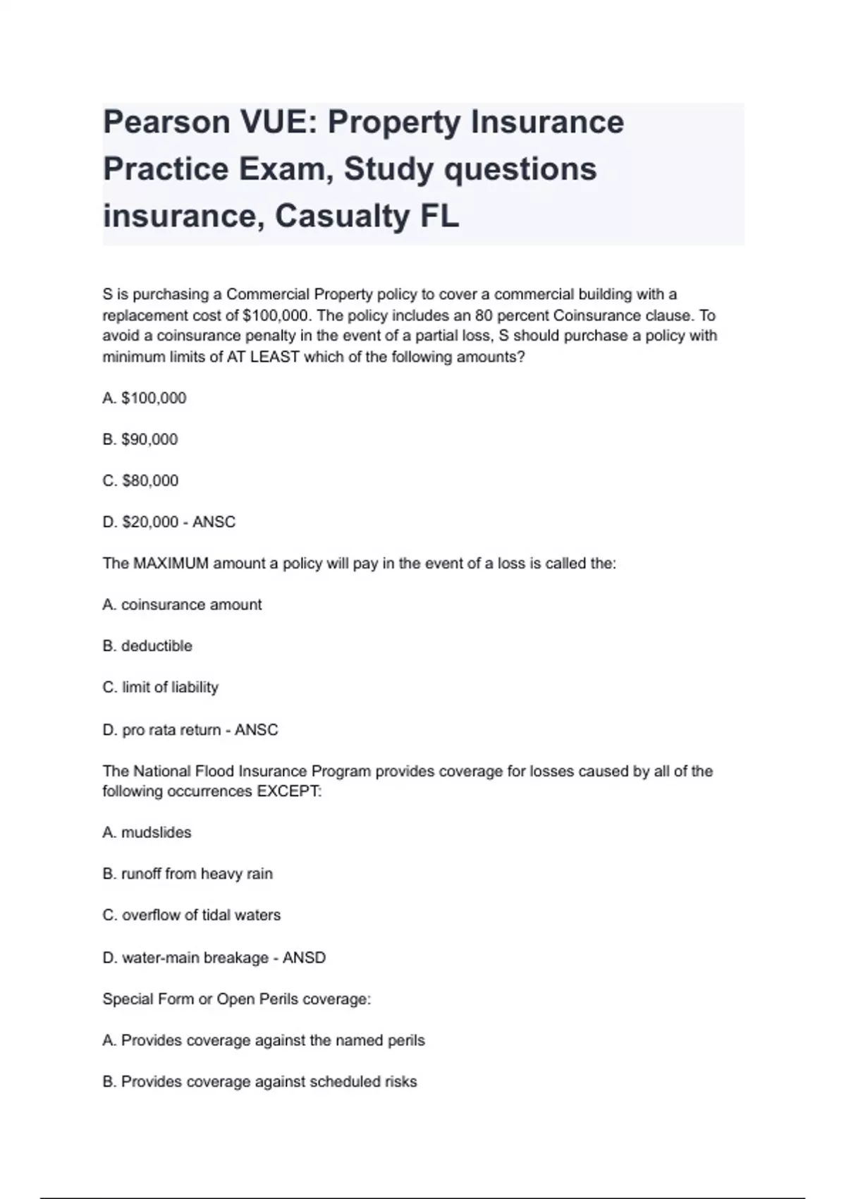 Pearson VUE: Property Insurance Practice Exam, Study questions insurance, Casualty FL 2024/2025 already graded A+