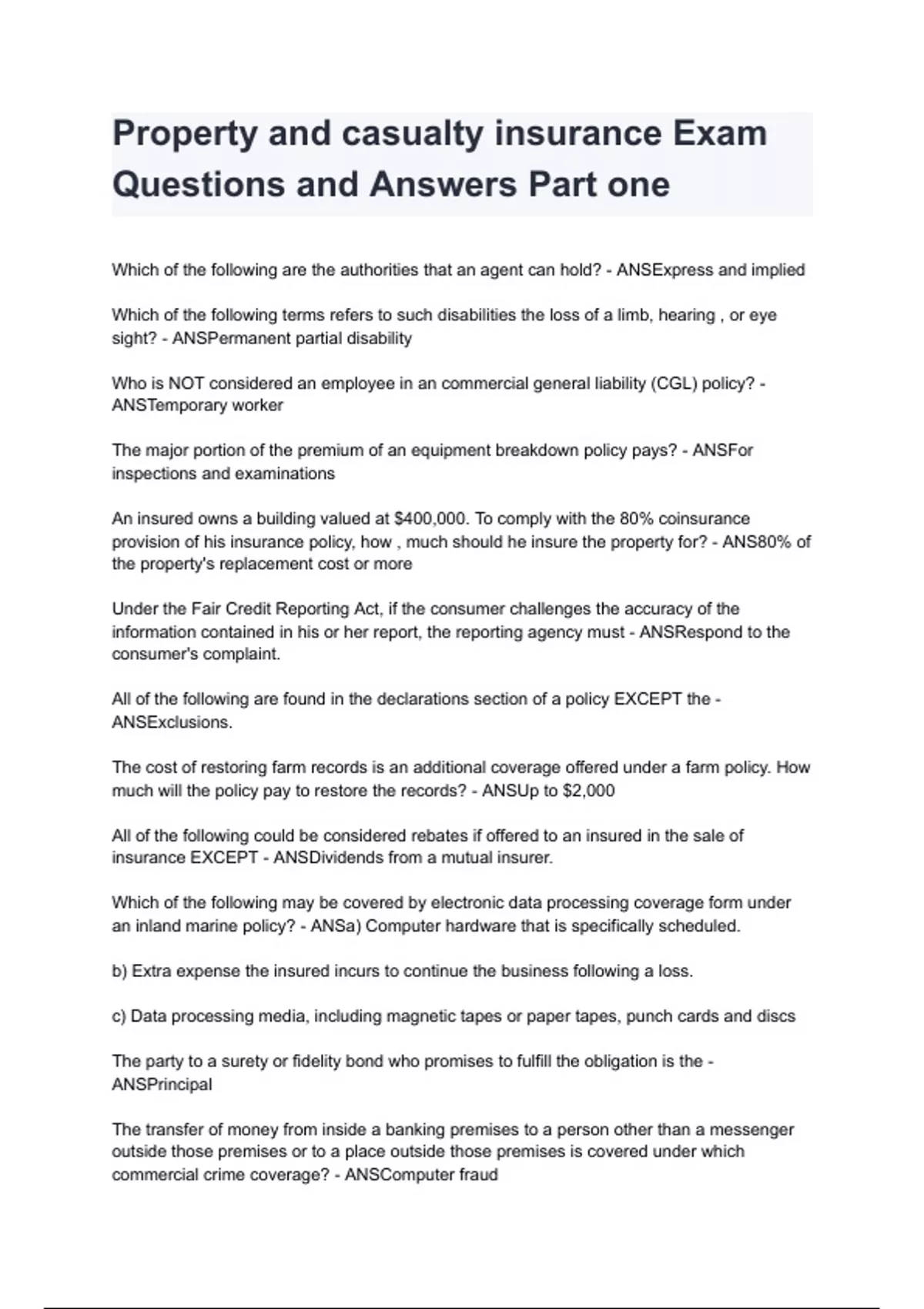 Property and casualty insurance Exam Questions and Answers Part one 2024/2025 already graded A+