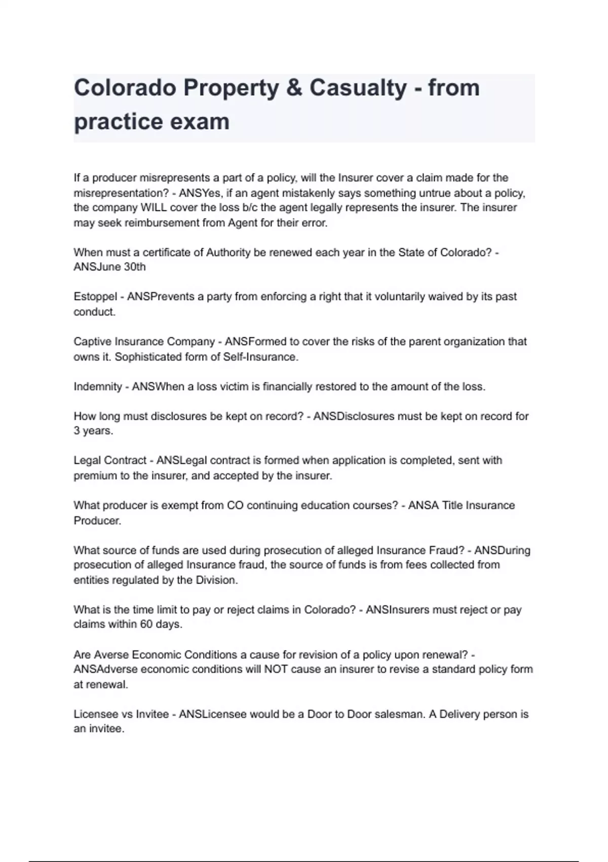 Colorado Property & Casualty - from practice exam 2024/2025 already graded A+