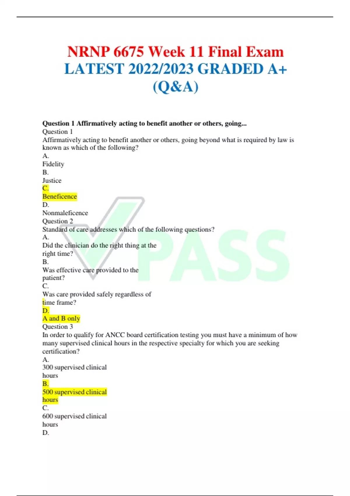 NRNP 6675 Week 11 Final Exam LATEST 2022/2023 GRADED A+ (Q&A) Question 1 Affirmatively acting to benefit another or others, going... Question 1 Affirmatively acting to benefit another or others, going beyond what is required by law is known as which of the following? A. Fidelity B. Justice C. Beneficence D. Nonmaleficence Question 2 Standard of care addresses which of the following questions? A. Did the clinician do the right thing at the right time? B. Was effective care provided to the patient? C. Was care provided safely regardless of time frame? D. A and B only Question 3 In order to qualify for ANCC board certification testing you must have a minimum of how many supervised clinical hours in the respective specialty for which you are seeking certification? A. 300 supervised clinical hours B. 500 supervised clinical hours C. 600 supervised clinical hours D. 800 supervised clinical hours Question 4 All of the following are risk factors for sexual assault EXCEPT A. Religion B. Serious mental illness C. Substance use disorder D. Family history of sexual abuse Question 5 A personality disorder characterized by emotional constriction, orderliness, perseverance, stubbornness, indecisiveness, and a pervasive pattern of perfectionism and inflexibility is known as which of the following? A. Depressive personality disorder B. Borderline personality disorder C. Dependent personality disorder D. Obsessive-compulsive personality disorder Question 6 A late-appearing adverse effect of neuroleptic drugs is known as which of the following? A. Akathisia B. Parkinsonism C. Neuroleptic malignant syndrome D. Neuroleptic-induced tardive dyskinesia Question 7 Which of the following selective serotonin-reuptake inhibitors (SSRIs) has the most pronounced effect on prolongation of QT interval? A. Sertraline (Zoloft) B. Citalopram (Celexa) C. Escitalopram (Lexapro) D. Fluoxetine (Prozac) Question 8 Which of the following developed a Biblically-based cultural competence model for healthcare professionals? A. Spector B. CampinhaBacote C. Kim-Godwin, et al D. Papadopoulos, et al Question 9 ARNPs caring for vulnerable populations are responsible for which of the following? A. Providing a quick assessment B. Providing housing C. Recognizing and responding to the needs of the population in a timesensitive manner D. All of the above Question 10 The ARNP working in a primary care office knows which of the following information is consistent with what is known regarding suicide screening? Select all that apply. A. Question 1 Affirmatively acting to benefit another or others, going... Question 1 Affirmatively acting to benefit another or others, going beyond what is required by law is known as which of the following? A. Fidelity B. Justice C. Beneficence