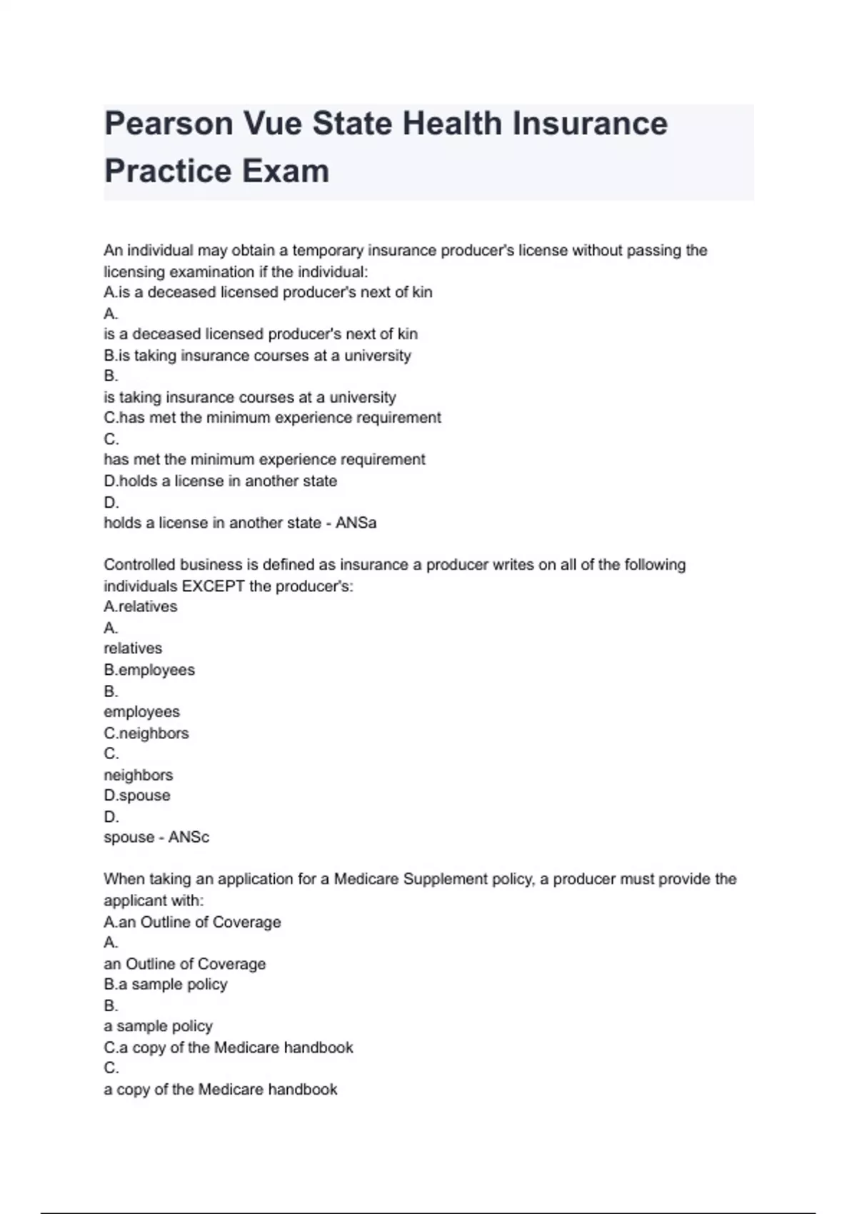 Pearson Vue State Health Insurance Practice Exam 2024/2025 already graded A+