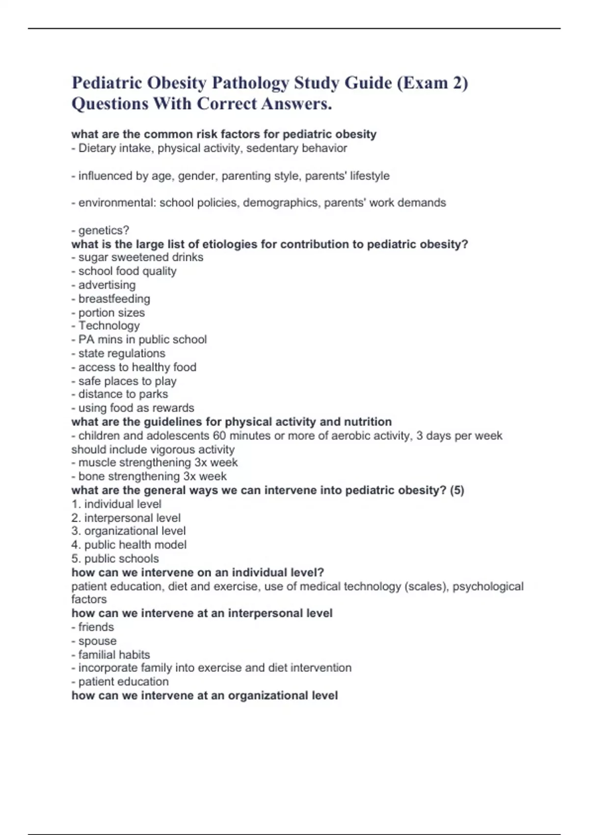 Pediatric Obesity Pathology Study Guide (Exam 2) Questions With Correct Answers. what are the common risk factors for pediatric obesity - Dietary intake, physical activity, sedentary behavior - influenced by age, gender, parenting style, parents' lifestyle - environmental: school policies, demographics, parents' work demands - genetics? what is the large list of etiologies for contribution to pediatric obesity? - sugar sweetened drinks - school food quality - advertising - breastfeeding - portion sizes - Technology - PA mins in public school - state regulations - access to healthy food - safe places to play - distance to parks - using food as rewards what are the guidelines for physical activity and nutrition - children and adolescents 60 minutes or more of aerobic activity, 3 days per week should include vigorous activity - muscle strengthening 3x week - bone strengthening 3x week what are the general ways we can intervene into pediatric obesity? (5) 1. individual level 2. interpersonal level 3. organizational level 4. public health model 5. public schools how can we intervene on an individual level? patient education, diet and exercise, use of medical technology (scales), psychological factors how can we intervene at an interpersonal level - friends - spouse - familial habits - incorporate family into exercise and diet intervention - patient education how can we intervene at an organizational level